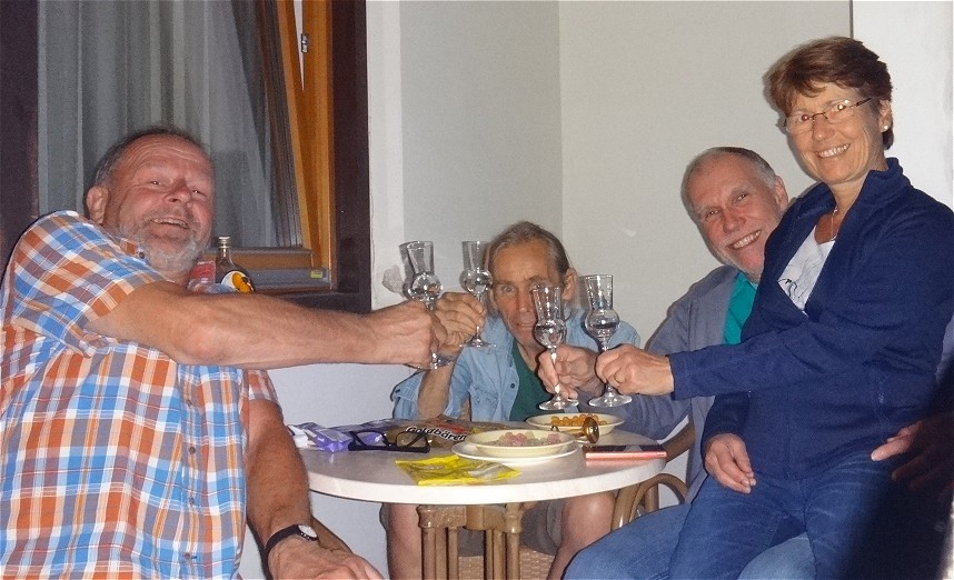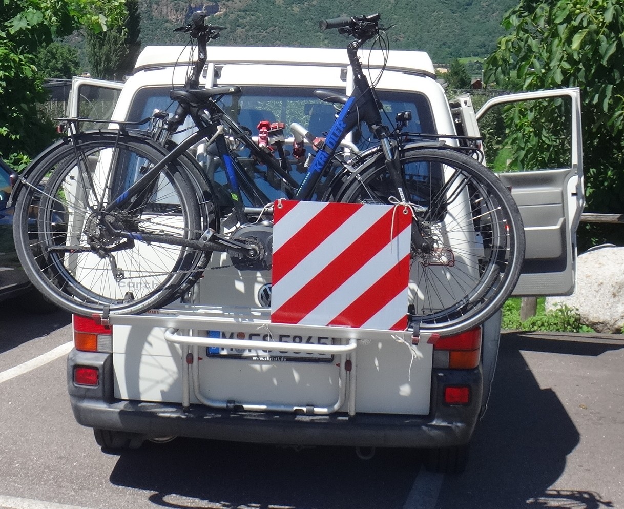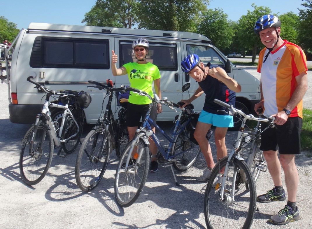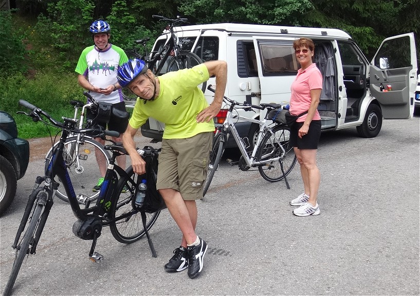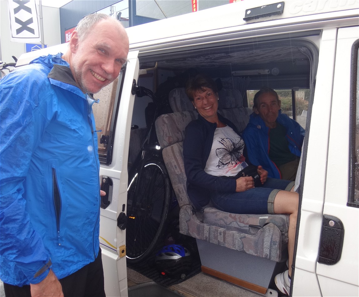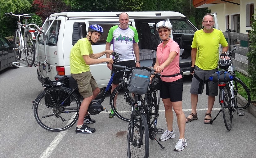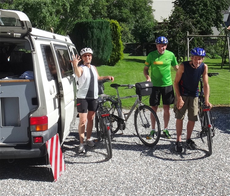 Wir waren uns alle einig: Es war eine tolle Tour mit ganz viel Spaß! Sehr gelobt wurde auch mein VW-Bus. Er war das ideale Begleitfahrzeug, mit dem wir unkompliziert 4 Personen, 4 Räder, Gepäck und Proviant transportieren konnten. Die Campingausrüstung haben wir (bis auf den Kühlschrank) nicht gebraucht, aber wenn mal eine Brotzeit angesagt war, waren Teller, Gläser und Besteck an Bord. Bis auf eine kleine Komplikation mit der Rückenlehne der Sitzbank am Tag 4 gab's keine technischen Probleme. Und wir sind alles in allem 1.015 km gefahren! |