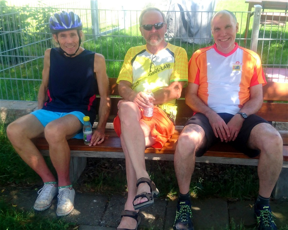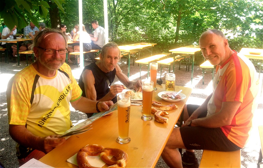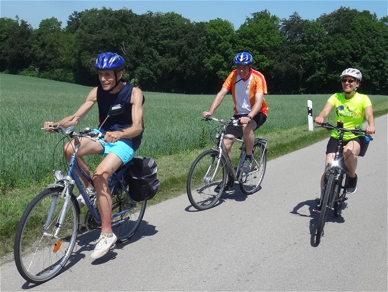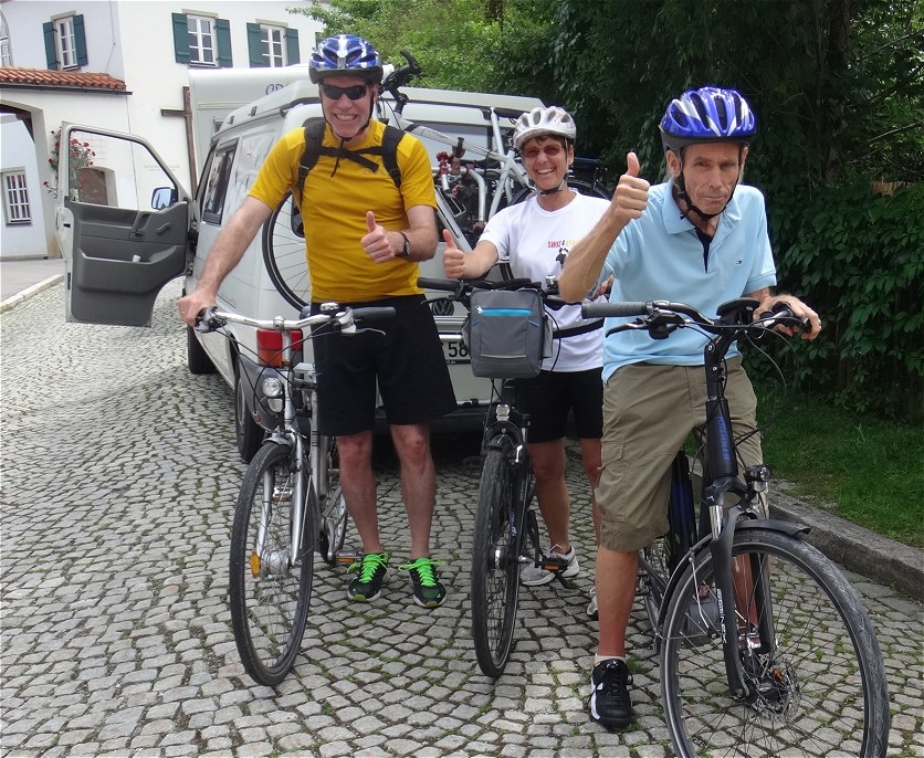 Punkt 2: Wir sind im VW-Bus mit 4 Leuten und 4 Fahrrädern von Steinebach nach Andechs gefahren (und hinterher wieder zurück): Es ging problemlos. Auf der echten Tour haben wir diese Konstellation nur bei der Anfahrt nach Füssen, bei der Rückfahrt von Italien, und wenn's zwischendrin Situationen geben sollte, wo wir alle im Auto fahren. Eher unwahrscheinlich! Aber jederzeit möglich. Punkt 3: Mathias hat fleißig trainiert und diese 20km-Runde hat ihn nicht überfordert. Im Gegenteil: Eine zweite Runde wäre durchaus möglich gewesen. Auf Gefälle- Strecken lässt's Mathias krachen, bei Steigungen kommt er an seine Grenzen, und je langsamer es wird, umso mehr kommt auch sein Parkinson-Zittern zum Zuge. Punkt 4: