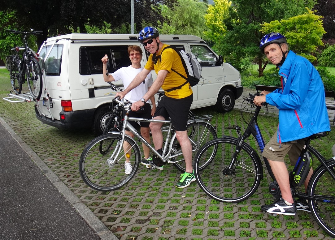In meiner Antwort auf die Dank-Mail von Mathias schrieb ich: "Mach es!", und das wiederum gab Mathias "richtig etwas Feuer unter den Hintern" und er fing an, regelmäßig zu trainieren. Jetzt muss man dazusagen: Mathias leidet seit 18 Jahren an einer Parkinson-Erkrankung, die ihn nicht nur körperlich einschränkt, sondern auch seine finanziellen Möglichkeiten stark begrenzt. Deshalb auch die STM-Spende. Aber: Die Idee war geboren, zusammen mit Bea und Flori haben wir Realisierungsmöglichkeiten diskutiert, und am 21. März machten wir dann bei einer Vorbesprechung "Nägel mit Köpfen": Mathias hatte die Via Claudia Augusta als Strecke rausgesucht, wir einigten uns auf den Termin 11. bis 18. Juni und mein VW-Bus wurde als Begleitfahrzeug fest eingeplant, so dass wir völlig flexibel und unabhängig sind. |