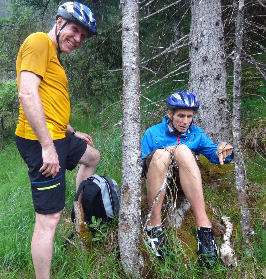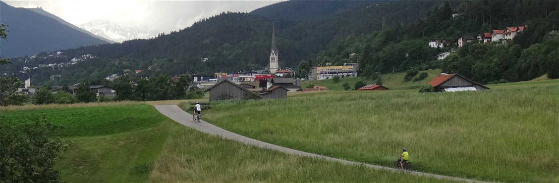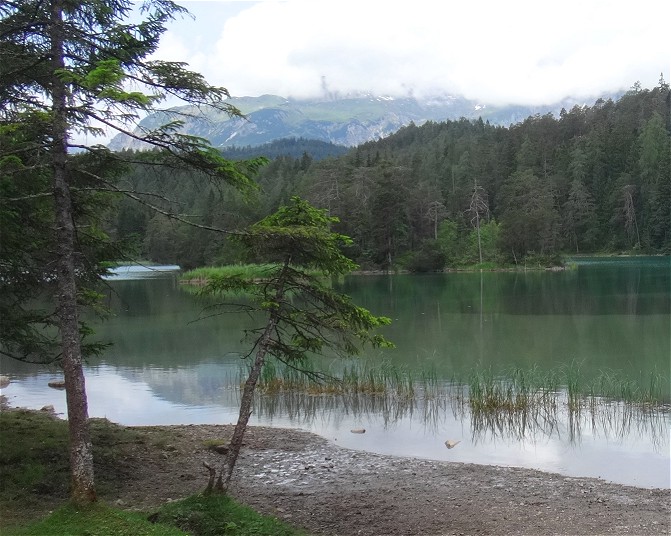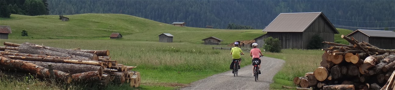 Auf der ersten Etappe bis zum Weißensee war Flori unser VW-Busfahrer, ab dort übernahm dann Bea das Steuer. Mathias strampelte mit vollgeladenem Akku tapfer die für ihn unangenehme Schotter-Strecke hinauf. Der Radlweg folgt der alten Römerstraße, und der alte Passübergang lag deutlich höher als der jetzige, so dass wir sozusagen "von oben" zum Fernpass runter fuhren. Auf den letzten Metern legte Mathias dann einen ungeplanten Abstieg hin: Die abschüssige Schotterstrecke ging in Asphalt über, aber zahllose Biker vor uns hatten den Schotter auf den Asphalt verfrachtet, eine tückische Konstellation! Die Abfahrt vom Fernpass zum Fernsteinsee hatte es dann wirklich in sich: starkes Gefälle auf schmalen Schotterwegen, teils ging's auf der linken Seite in den Abgrund, teils gab's Schiebestrecken, die sogar versierten Mountainbikern zur Ehre gereichen. Aber: wir haben's ohne weitere Zwischenfälle gepackt. Respekt, Mathias! Die Mittagspause am Fernsteinsee hatten wir uns redlich verdient, und von hier aus ging es nun deutlich entspannter auf landschaftlich tollen Strecken runter ins Inntal. |