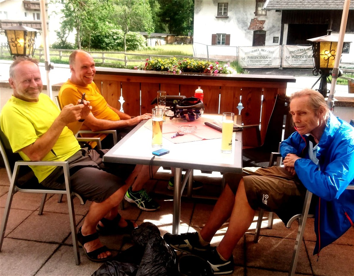 | Heute war der Fernpass angesagt. Immerhin ein Anstieg von 500 Höhenmetern. Deswegen wollten wir auch um 9 Uhr starten. Etwas später wurde es dann doch, weil Mathias den Sattel noch optimiert haben wollte, weil Bea den Autoschlüssel suchte (der an der Tür steckte) und ich noch eine Weile nach der SD-Karte meiner Kamera fahndete (die in der Kamera steckte, von dieser aber nicht erkannt wurde). |