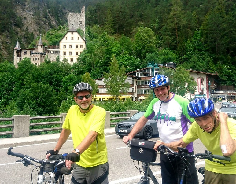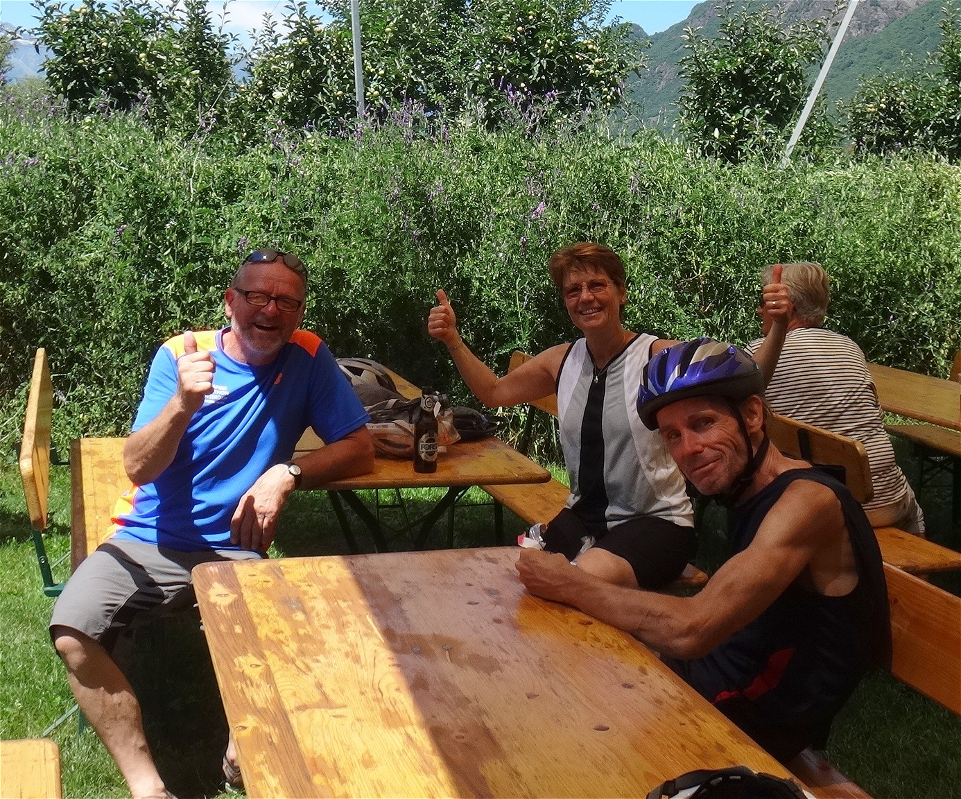 In Prad gab's dann einen Fahrerwechsel: Ich übernahm die Fahrt nach Latsch. Gerade als ich mich von dort aus aufmachen wollte, den Radlern entgegen zu fahren, standen sie schon vor der Tür! Wir waren also schon mittags mit unserer Radl-Etappe fertig! Gut so, denn es ergab sich ein sehr vergnüglicher Nachmittag in Latsch. |