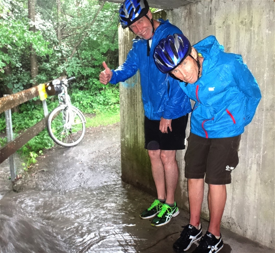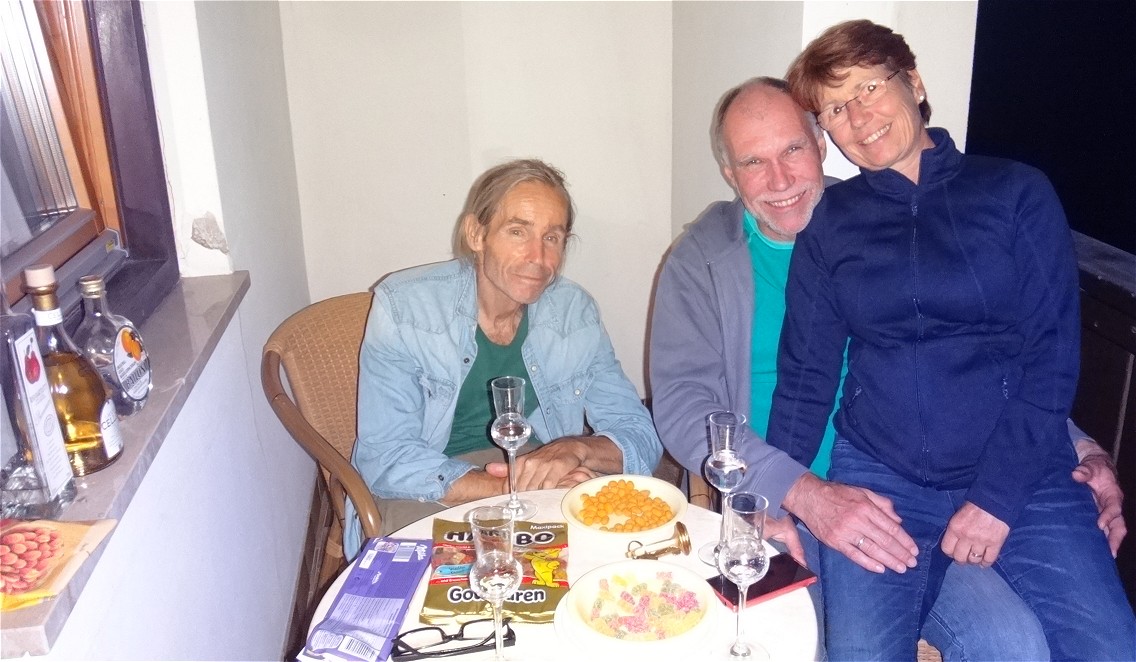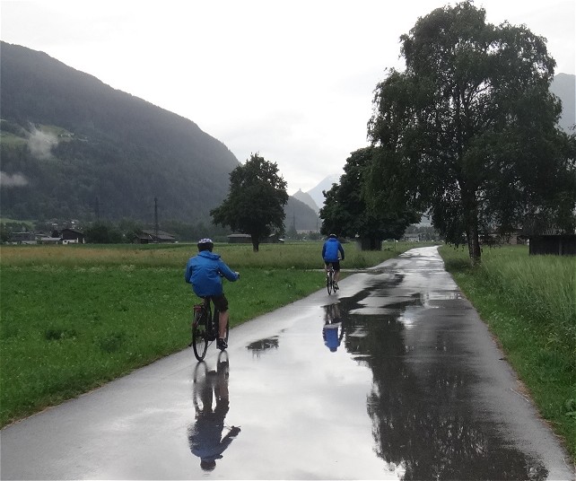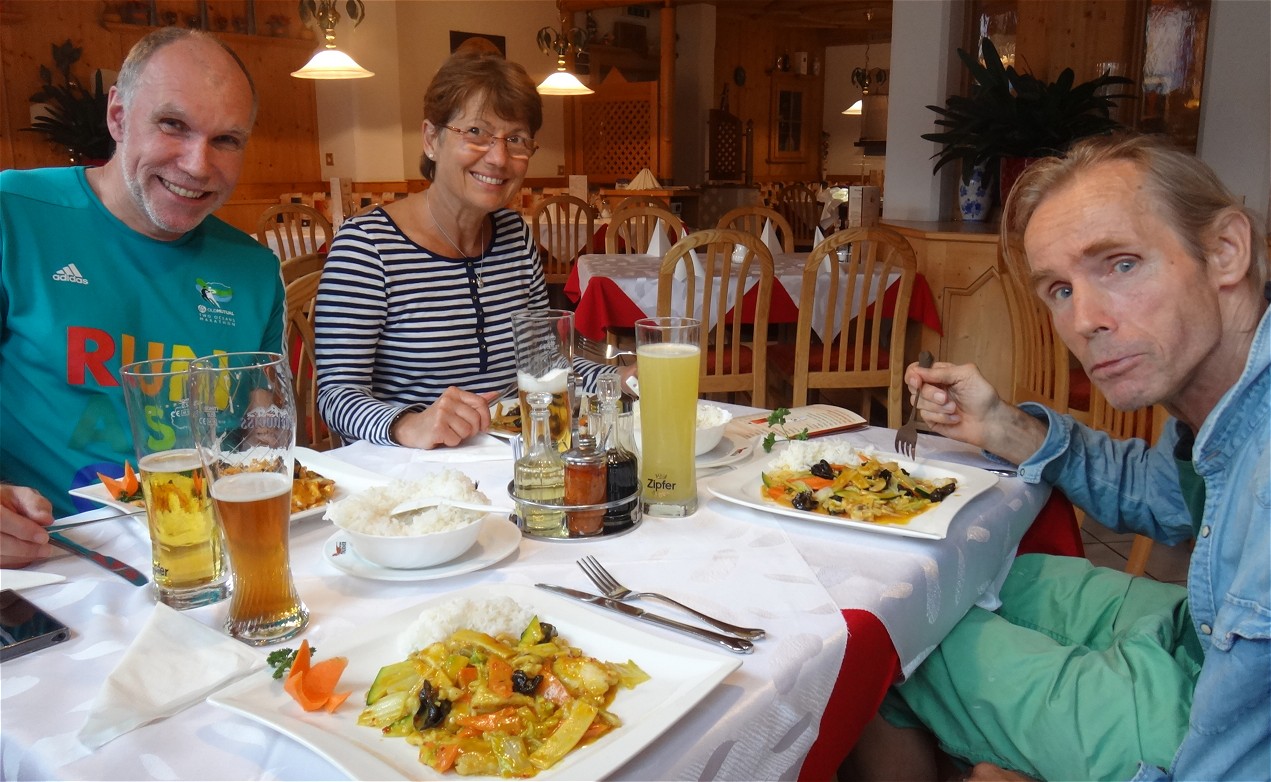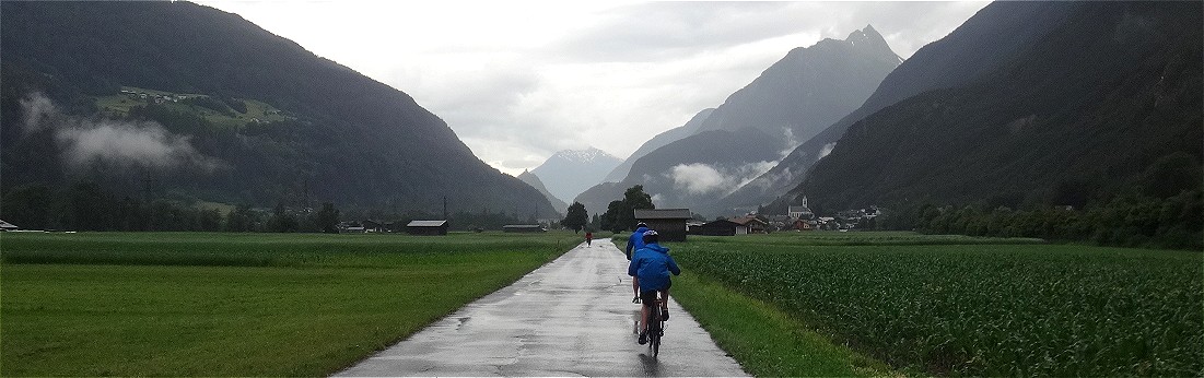 Das Wetter hatte sich den ganzen Tag gut gemacht: Bewölkt zwar, aber trocken. Auf dem Innradweg kurz hinter Imst bekamen wir dann aber die tägliche Nachmittags- Dusche ab. Hatte aber auch was, denn seit heute können wir behaupten: Wir haben die Inntal-Autobahn zum Unterstellen genutzt, und zwar nicht unter einer Brücke, sondern in einem schmalen Fußgängertunnel, in dem das Wasser zunehmend anstieg. Die letzten ca. 10 km nach Zams blieben nicht ganz trocken, aber das Schlimmste hatten wir überstanden. Flori legte ordentliches Tempo vor, Mathias zog nach, und ich kam auch noch mit. Im Gasthof Thurner hatte Bea, unsere "Check-In-Beauftragte", schon wieder alles klar gemacht, allerdings funktioniert die Handy-Kommunikation mit Flori noch nicht richtig: Wir brauchten 10 Minuten, um an der Rezeption unsere Zimmernummern zu erfragen, obwohl Bea diese dem Flori längst mitgeteilt hatte. Das Abendessen war chinesisch, denn das Haus ist in chinesischer Hand. Und so gab's beim Bezahlen einen warmen Pflaumenwein aufs Haus, bevor wir dann unsere Balkon-Bar eröffneten ... Fazit: Eine schwere Etappe, die wir aber erfolgreich gemeistert haben |
