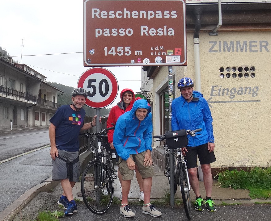 Für die heutige Etappe hatten wir ja gestern Abend schon diverse Optionen diskutiert. Rausgekommen ist dabei: wir fahren alle bis Nauders im Auto. Wer möchte, kann von dort die restlichen Höhenmeter zum Reschenpass hochstrampeln und es dann auf der italienischen Seite bergab rauschen lassen. Das Wetter war wie angesagt: Dauerregen seit der Nacht! Es gab also einen ganz entspannten Vormittag, den ich u.a. dazu nutzte, beim örtlichen Fahrradfachgeschäft meines Vertrauens die Schaltung meines Bikes einstellen zu lassen. Mehrmals war mir nämlich in den letzten Tagen beim Runterschalten die Kette rausgesprungen. Das passierte dann allerdings auch heute wieder, so dass ich mich frage: Waren die 20 € für die Katz', oder liegt ein Bedienungsfehler vor ... Mittags starteten wir dann wie geplant alle im Auto Richtung Nauders. Dort regnete es immer noch, also weiterhin kein Grund zur Eile! Im Bistro eines Supermarkts machten wir weiter Pause, aber so gegen 14 Uhr wollten wir los! Mathias war heute eher weniger für's Radln zu begeistern, vermutlich steckte ihm die gestrige Abfahrt vom Fernpass noch in den Knochen - und im Hirn. Also sattelten Flori und ich die Räder, Bea und Mathias fuhren im Auto weiter. Am Reschenpass wollten wir unbedingt ein gemeinsames Foto machen, es wurde aber nur eins vom "österreichischen" Reschenpass. Die eigentliche Passhöhe liegt in Italien, aber da gab's keinen Foto-Stop mehr. Der Regen ließ allmählich nach, und nach der hügeligen, aber landschaftlich tollen Umfahrung des Reschensees und des Haidersees erlebten Flori und ich eine grandiose Abfahrt über mehr als 20km, auf perfekten Radwegen, bestens markiert und ausgeschildert: Ein Traum! Wir konnten's wirklich rauschen lassen. An unserem Quartier, dem "Gasthof Stern" angekommen, beschäftigte uns zunächst ein technisches Problem am VW-Bus: Seltsamerweise lässt sich die Lehne der Sitzbank nicht mehr umklappen! Und da war die Frage: Wie bekommen wir jetzt das Pedelec von Mathias wieder raus? Es klappte aber, so dass das Problem zum Problemchen runtergestuft werden konnte, um das ich mich morgen Nachmittag mal kümmern werde. Der Abend im Stern war geprägt von Pizza, Rotwein, aufkommenden Diskussionen - und unserer Balkon-Bar mit erweitertem Sortiment ... Fazit: Beste Stimmung, morgen geht noch mehr! |