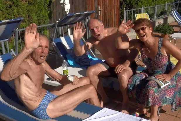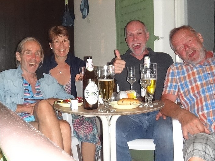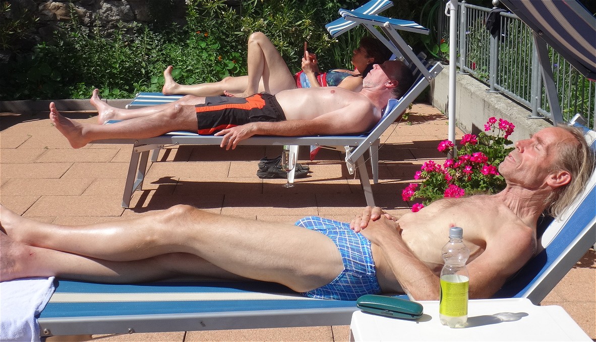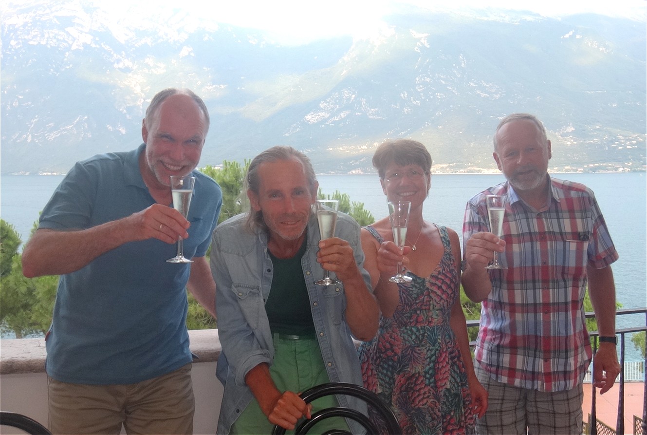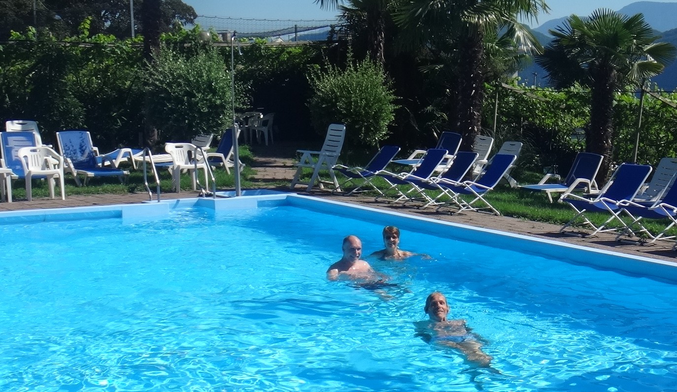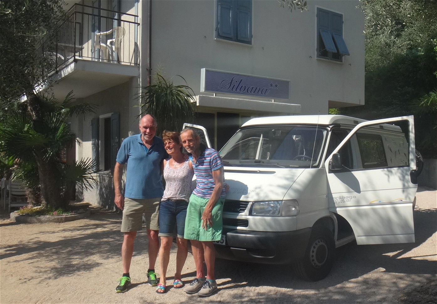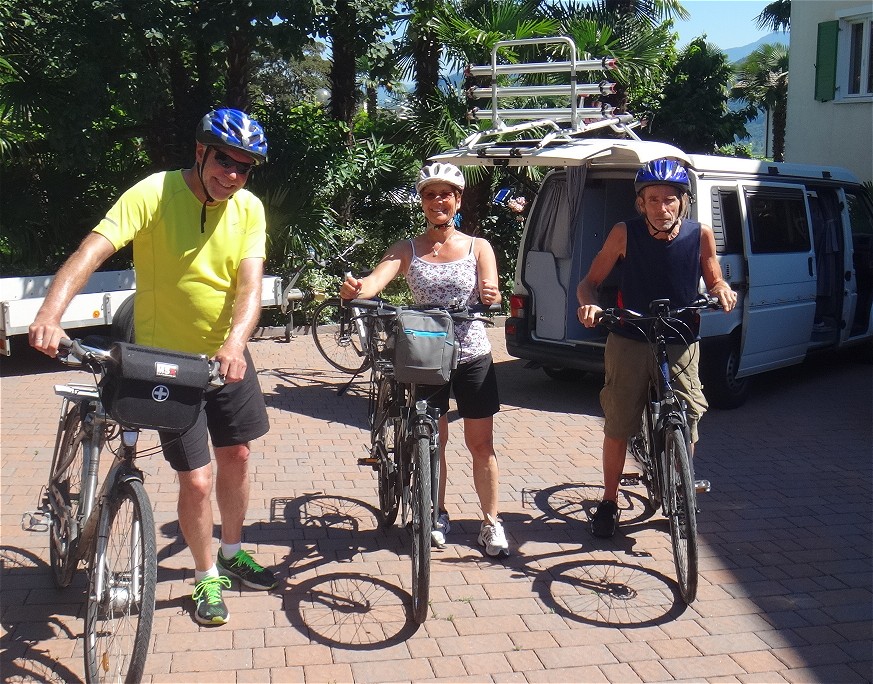 Bea empfing uns an perfekter Stelle in Riva. Sie hatte die 1,90m Höhenschranken großzügig ignoriert. Der VW-Bus ist mindestens 2m hoch, aber die 1,90m Schranken waren wohl gut 2,30m hoch. Also, nach kurzem Disput: Easy Going. Und zum Glück kein VW-Bus Cabrio! Ein weiteres Thema war, ob man von Riva nach Limone radeln kann. Die Antwort ist: Man kann! Aber entweder geht's auf der Küstenstraße durch Tunnels und Galerien auf der Hauptstraße entlang (nicht zu empfehlen), oder es geht über die Berge. Ein aktuelles Projekt will einen durchgängigen Ufer-Radlweg schaffen. Erste Aktivitäten haben wir heute bereits gesehen! Für uns war schon die Ankunft in Riva ein Highlight. Nach Limone sind wir mit dem Auto gefahren. Im dortigen Hotel Silvana und dem angeschlossenen Campingplatz gab's den besten Pool der Woche, eine Flasche Prosecco, spendiert von Mathias, ein Abendessen mit Blick über den See, und eine Balkon-Bar-Session mit Musik-Wünschen und ebenfalls Blick über den See. Fazit: Besser hätte das Finale unserer Cross-Alps-Tour nicht ausfallen können! |