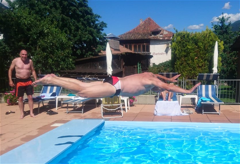 Aber im Hotel Rechtenthal wartete ein kühles Bier und ein großer Pool auf uns. In der Pizzeria gab's abends nicht nur leckeres Essen und eine tolle Aussicht übers Tal, sondern auch eine Besonderheit der speziellen Art: Der Sohn des Hauses hatte 2009 bei "Wetten Dass" mitgemacht. Er hatte gewettet, dass er es schafft, in 5 Minuten, auf einem Motorrad fahrend, eine Pizza zuzubereiten und zu backen. Er hat die Wette gewonnen und ist seither wohl der Held von Tramin. Das Motorrad samt Pizzaofen kann man bewundern, ebenso wie diverse Zeitungsartikel. Später am Abend öffnete wieder unsere Balkon-Bar. Heute hatten wir einen gemeinsamen Balkon. Weil ich eine Melodie summte, die jeder kannte, deren Titel aber niemand nennen konnte, gab's eine Musik-Recherche (es war "Games People Play" vom weltbekannten Joe South) und danach eine veritable Oldie-Hitparade (Youtube macht's möglich!). Ich hatte nach jedem letzten Lied noch ein allerletztes auf Lager, Mit "The longest time" von Billy Joel ließen wir's dann kurz vor halb eins bewenden. Für Mathias ging das Akustik-Erlebnis allerdings weiter: Er stand mitten in der Nacht auf und machte unsere Balkontüre zu: Das sonore Grundgeräusch aus dem Nachbarzimmer vertrug sich nicht mit seinem leichten Schlaf... |