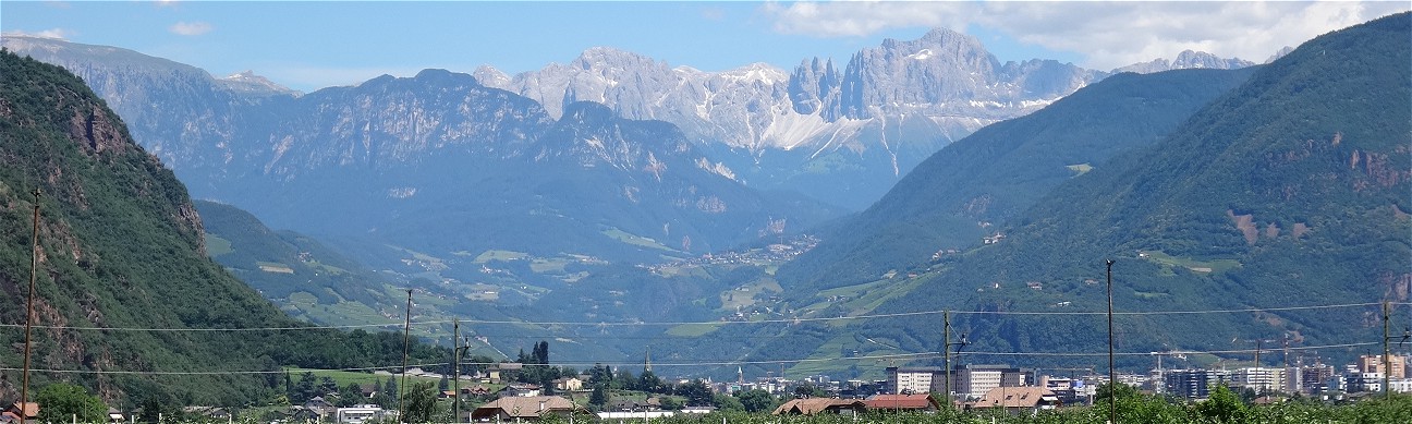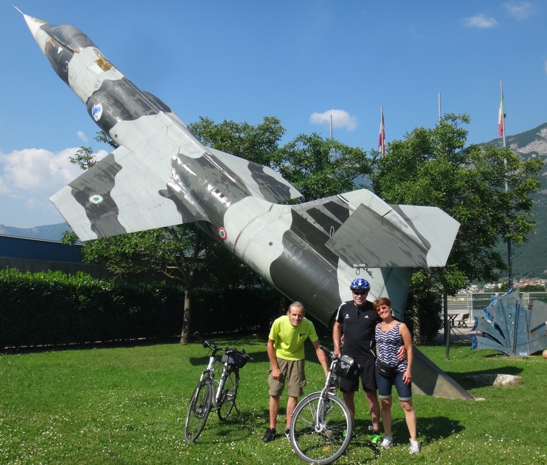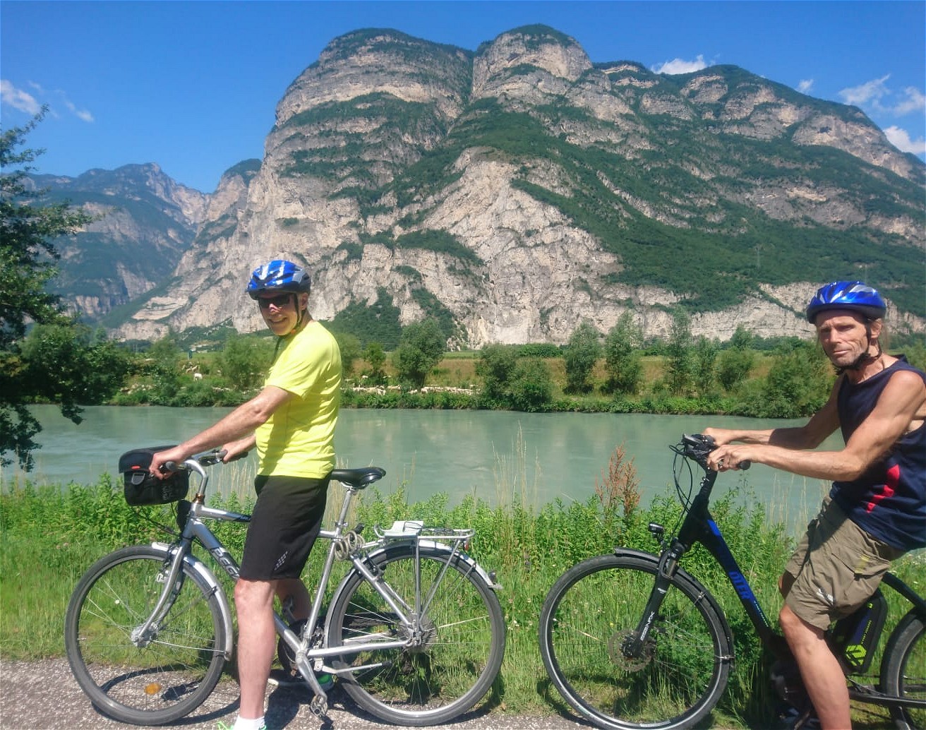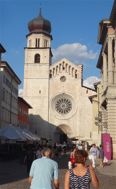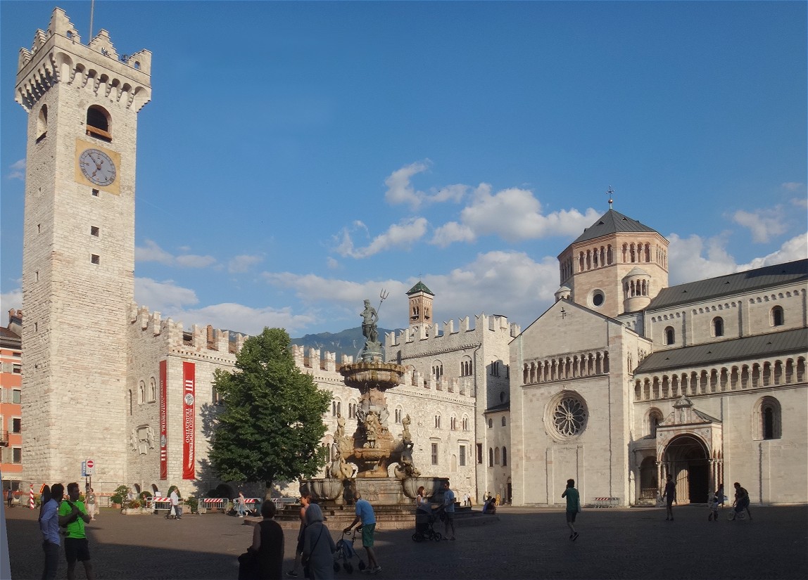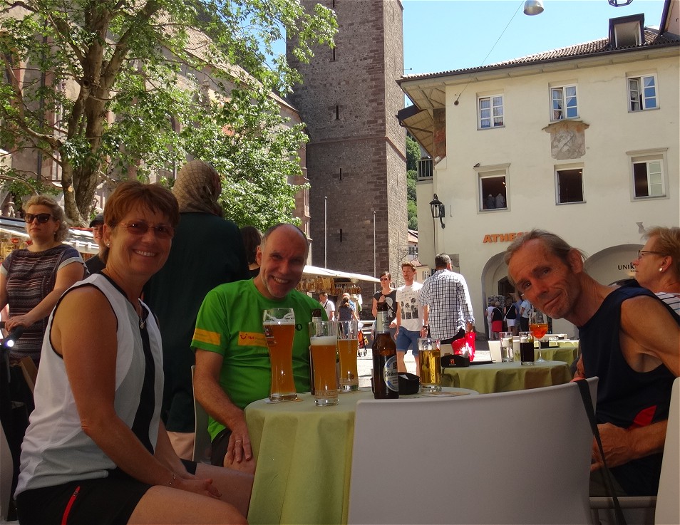 Nach dem Check-In im Flybike-Hotel am "Trento International Airport" bin ich den dreien dann entgegen geradelt, und es hat nur ca. 10 min gedauert, dann waren wir (für das kurze letzte Stück) wieder zu viert auf den Radln unterwegs. Nach einer Brotzeit im Zimmer und situativ-individueller Augenpflege fuhren wir abends ins Zentrum von Trento. Kurze Besichtigung des Doms und der Innenstadt, dann Abendessen. Zurück am Hotel noch ein gemütliches Bier vorm Bistro, aber heute weder Oldie-Hitparade noch Balkon-Bar (wir haben keinen Balkon). |