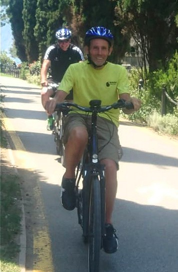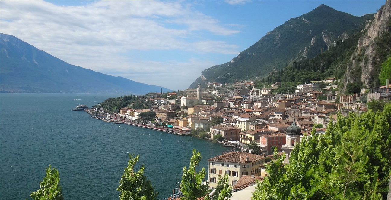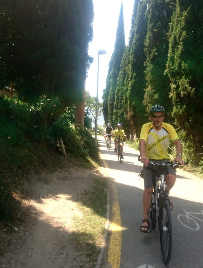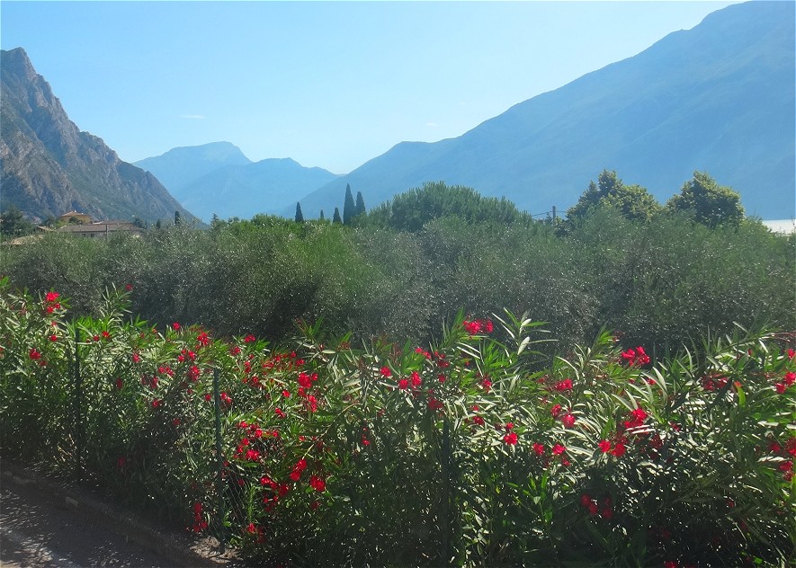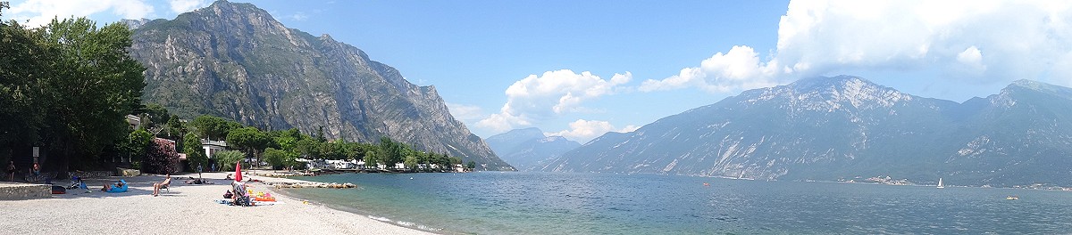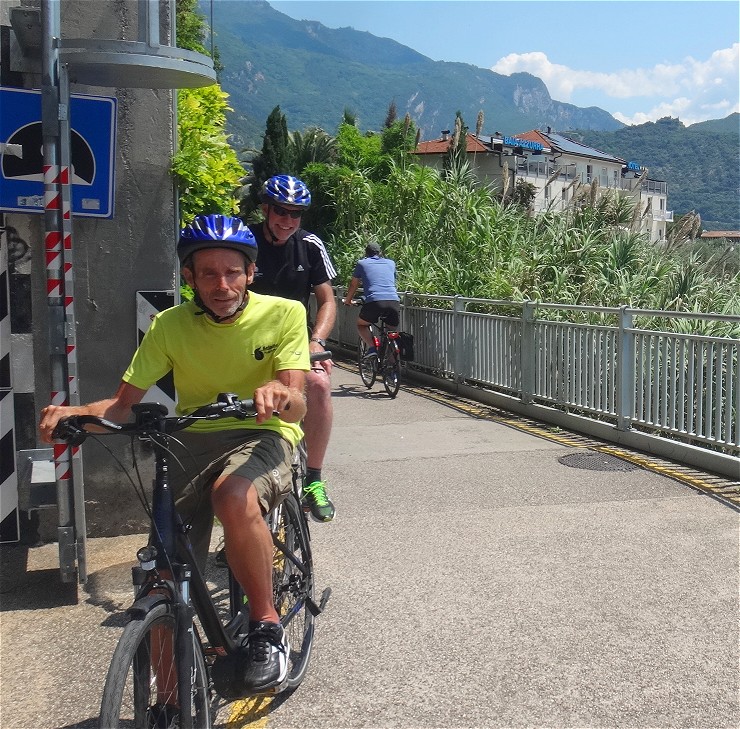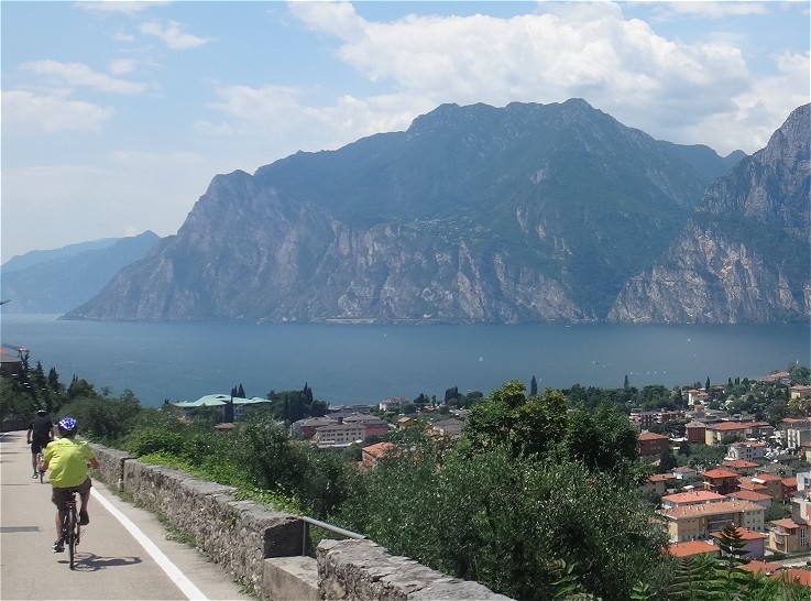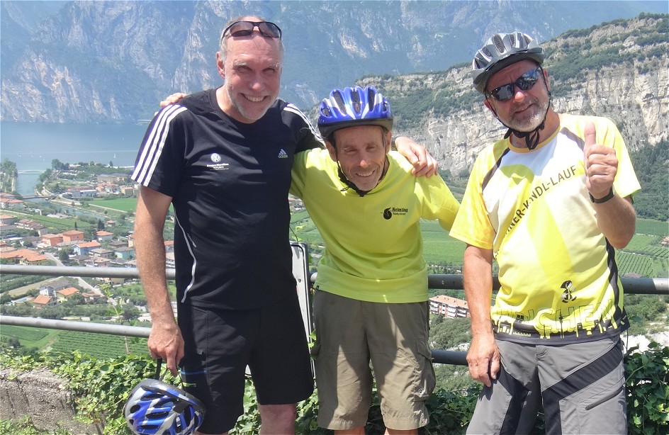 Die letzte Teilstrecke von Mori bis Torbole war wieder recht hügelig, schließlich hatten wir uns in Mori vom Etschtal verabschiedet. Es ging noch über den Passo San Giovanni (287m), und obwohl so manche Webseite über den Pass spottet: Für uns war's noch mal ein richtiger Anstieg, bei dem der kleinste Gang bzw. die größte Pedelec-Stufe gefordert waren. Belohnt wurden wir mit einem traumhaften Blick über den Gardasee, hoch über Torbole, und mit einer finalen Abfahrt (10% Gefälle) runter an den See. |