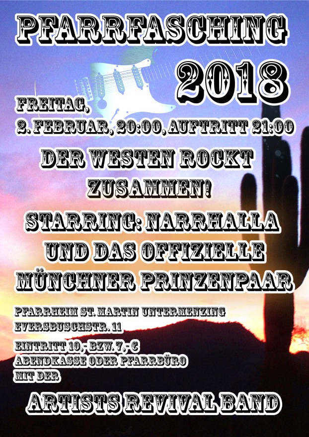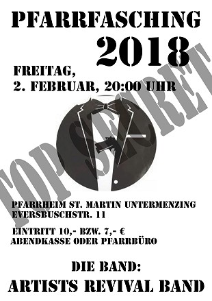 Das war im doppelten Sinn neu für uns: Der Veranstalter des Menzinger Pfarrfasching 2018 hat uns überraschend frühzeitig ein Plakat mit dem Motto "Top Secret" zukommen lassen. Kurze Zeit später wurde "Top Secret" aber offenbar wieder einkassiert, das neue Motto lautet nun: "Der Westen rockt zusammen!" Die Gründe für den Sinnes- bzw. Motto-Wandel kennen wir nicht, sie sind uns aber auch ziemlich egal! Musikalisch hatten wir uns ja bisher noch nie auf ein bestimmtes Motto eingelassen: Wir spielen einfach unser Programm! 2017 hatten wir ja eine "Faschings-Auszeit": Die Faschings- bälle der Pfarrgemeinschaft wurden sinnvollerweise zusam- mengelegt, der Pfarrfasching 2017 fand in Allach statt, und dort gab's schon eine andere Band. Umso mehr freuen wir uns, dass wir dieses Jahr in Unter- menzing wieder aufspielen dürfen. Und wir hoffen natürlich auch, dass möglichst viele Allacher den Weg zu uns nach Untermenzing finden, Motto hin oder her! PS: Das Plakat wurde ein 3. Mal geändert, denn um 21:00 Uhr tritt die Narrhalla auf! Na wenn das kein Publikums- Magnet ist! Wir rechnen mit einem vollen Saal! |