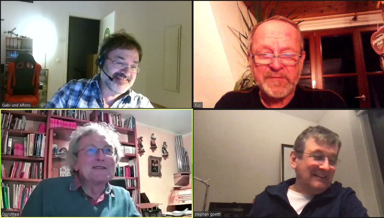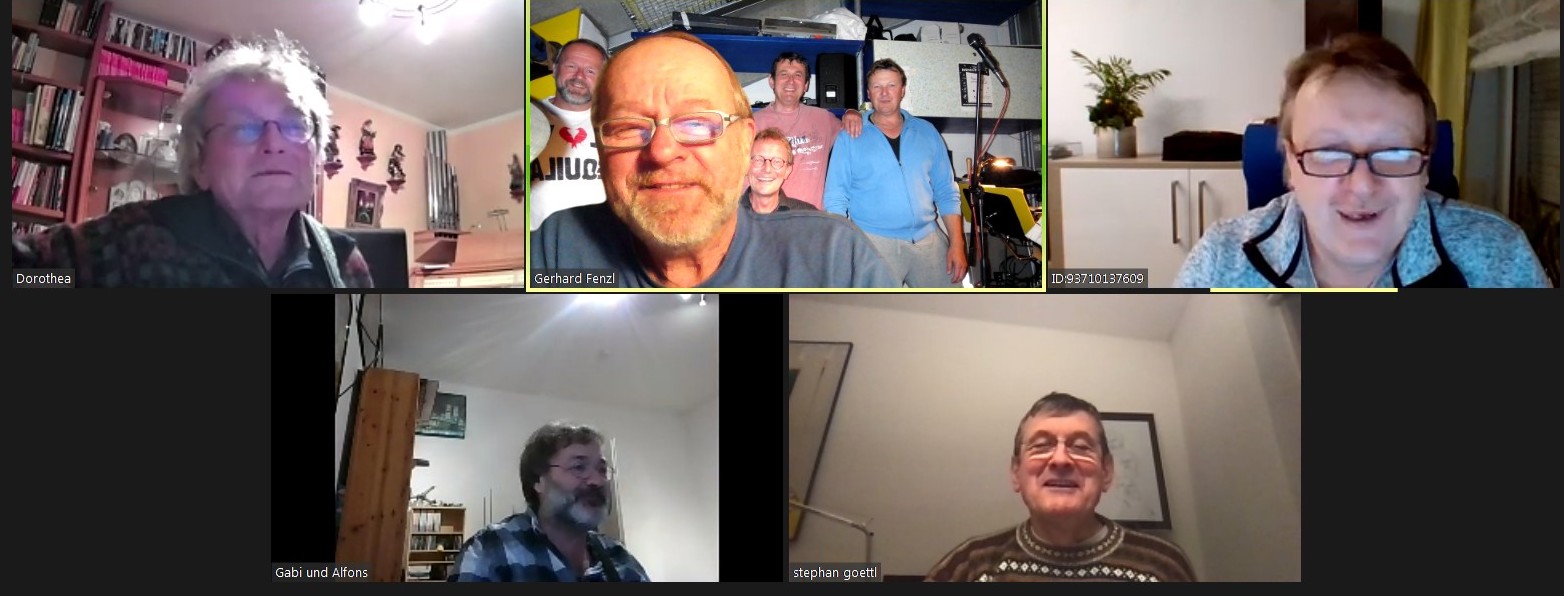 Wir haben jetzt unseren geballten gemeinsamen Optimismus zusammengenommen und die nächste REALE Bandprobe am 8. März (2021!) anberaumt. Und da soll uns bitte weder Söder noch sonstwer dazwischenfunken! Anbei wieder ein Screenshot vom Meeting. Leider hab ich's irgendwie versemmelt, ein Bild zu machen, wo wir alle so schön verkleidet waren. |
