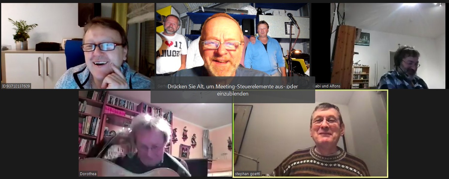 Jetzt haben wir uns wenigstens mal zu einer ZOOM-Schalte getroffen. Es war lustig, aber musikalisch hat's nicht funktioniert, weil es doch Laufzeit-Effekte gibt, die ein gemeinsames Musizieren erschweren bzw. verhindern. Mal abgesehen davon, dass unser Drummer Kurti daheim nicht trommeln darf - wegen der Nachbarn. Hier trotzdem zwei Screenshots unseres lustigen Meetings. Wir hoffen sehr, dass wir ab Februar wieder "ganz normal" proben können. |
