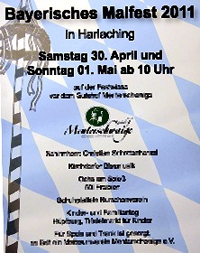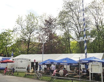 30.04.11, Tanz in den Mai / Menterschwaige, Harlaching Der Auftritt beim Maifest in Harlaching hatte sich über unsere Faschings-Aktivitäten in Immac ergeben. Direkt vor dem Biergarten Menterschwaige steht auf einer kleinen Wiese der Harlachinger Maibaum. Dort hatte der Veranstalter ein Festzelt mit einigem DrumHerum aufgebaut, und ab 19:00h waren wir dran, um den musikalischen Part für den Tanz in den Mai beizusteuern. |