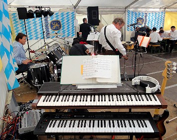 Wir übernahmen dann sozusagen im fliegenden Wechsel, für einen richtigen Soundcheck blieb keine Zeit. Eine spezielle Technik-Tücke betraf dann in erster Linie mich: Für die Stromversorgung im Festzelt war ein Generator zuständig und da kam es zu gewissen Spannungs-Schwankungen: Was im Zelt nur als kurzes Flackern der Beleuchtung bemerkt wurde, führte bei mir zu einem Keyboard-Reset! Und den gabs öfters! Wir vermuten: Jedes Mal, wenn sich die Kühlung eingeschaltet hat. |