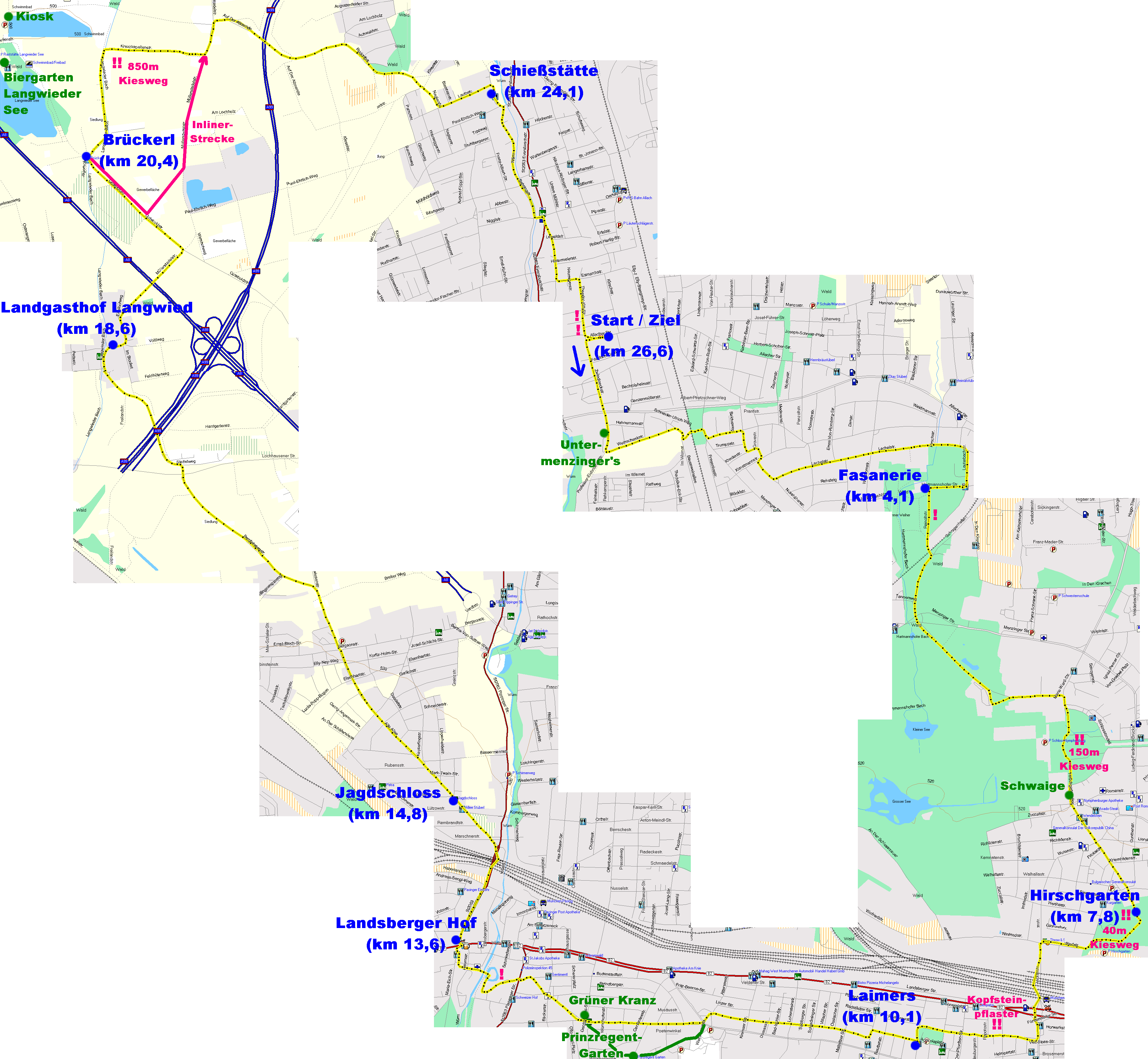 1.) Der Rückweg vom Hirschgarten an der Schlossmauer entlang ist ein "No Go" für die Blader: Also ab nach Laim und Pasing (wie auch schon mal gehabt ...) 2.) An der Langwieder Seenplatte überwiegen die Kieswege. Deshalb heuer ein "Approach" von Osten: Asphalt bis zum Brückerl, und dann für knapp einen Kilometer alternative Strecken für Blader und Läufer/Radler. Haupt-Stationen an der