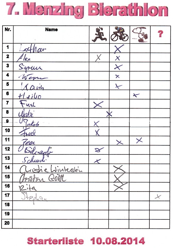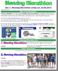 (05.08.) Diese Seite zum 7. Menzing Bierathlon geht Online! Die Vorankündigung hatte ich ja schon seit einigen Wochen auf meiner Running-Seite stehen, aber erst heute hab' ich eine eigene Seite für den 7. Menzing Bierathlon aufgemacht. In den nächsten Tagen wird es hier weitere Informationen zum 7. Menzing Bierathlon geben. |