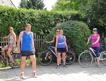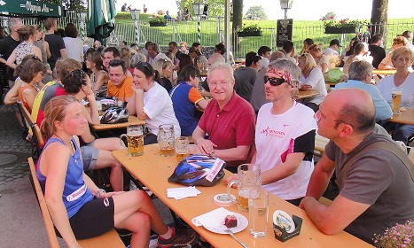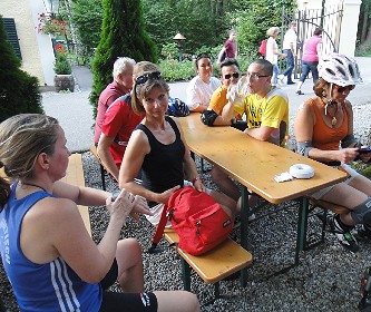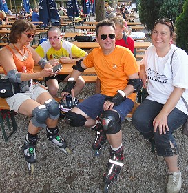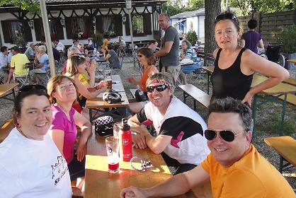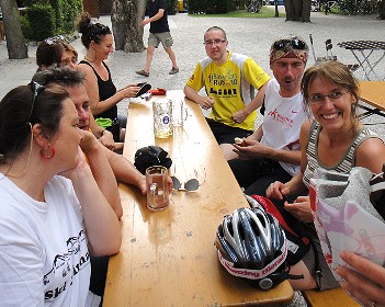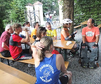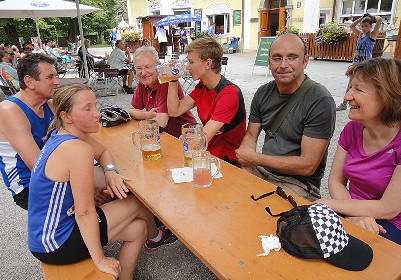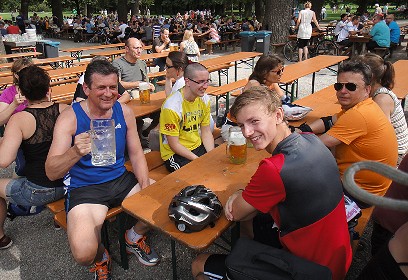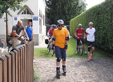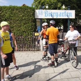 (12.08.) Der Bierathlon war so ganz nach meinem Geschmack Der Wetterbericht war ja schon sehr positiv gewesen, weil er die drohenden Gewitter in die späten Nachtstunden verschoben hatte. Das kam uns entgegen, und so konnte der 7. Menzing Bierathlon tatsächlich bei optimalen Bedingungen über die Bühne gehen. Heiß war's, keine Frage! Aber wir hatten ja 7 Einkehr-Stationen zur Regulierung des Flüssigkeits-Haushalts vorgesehen... Improvisieren mussten wir am Gut Nederling: Dort war geschlossene Gesellschaft angesagt. Die Alternative "Hex'ngarten" war wegen eines Todesfalls ebenfalls geschlossen, aber in der Kleingartenanlage hat's dann geklappt. Auch die Blader haben sich nicht über den langen Kiesweg beschwert ... Das Finale in der Inselmühle klappte wie geplant, erst danach fing es an zu regnen! Zur Streckenlänge: Mein Wegeisen hat leider nicht alle Etappen aufgezeichnet. Waren's Fehlbedienungen oder doch Probleme im Gerät? Keine Ahnung! Ich gehe mal von 23 km aus. Schnecki hat präziser gemessen: 13,2 km waren's auf ihrer Garmin-Uhr. |