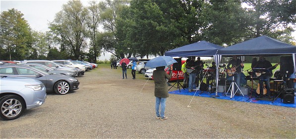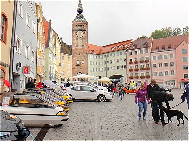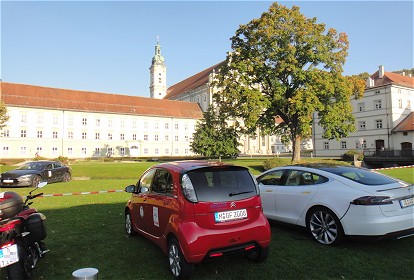 Ich war zeitig genug gekommen, um problemlos einen Platz auf der "Obstwiese" zu ergattern. Da es noch ca. 2 Stunden bis zum Start waren, machte es Sinn, ein bisschen nachzuladen. Ich konnte also mit (fast) voller Batterie starten. Und das war gut so, denn am nächsten Etappen-Ziel Weilheim hatten lade-technisch die "Challenge"-Teilnehmer den Vorrang. Ein CHAdeMO-Lader stand in Weilheim nicht zur Verfügung. Mir war's aber egal, ich schaute mich auf der Oberland-Messe (ORLA) um und fuhr dann ohne Zwischenladung weiter nach Starnberg. Dort konnte ich frühzeitig einen Platz in der Nähe eines Stromkastens ergattern, und trotz langsamer Ein-Phasen-Ladung mit 16A/3,7kW reichte es für den Rest des Tages. Sowohl in Weilheim als auch in Starnberg hatte ich interessante Begegnungen und Gespräche mit Teilnehmern und lokalem Publikum. Die Zeit verging wie im Flug und die Strecke von Starnberg nach FFB machte noch mal richtig Spaß. Zielankunft bei Traumwetter! |