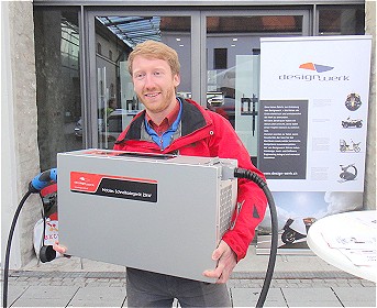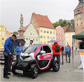 Die heutige Etappe war leider nicht vom Wetter begünstigt. Vor allem der Stopp in Diessen hatte unter heftigen Regenfällen zu leiden. Umso bemerkenswerter, dass der französische e-Biker trotzdem seine waghalsigen Motorrad-Sprünge vorführte. Auch in Landsberg war's bei der Ankunft noch nicht recht lauschig. Zudem gab's dort ladetechnische Probleme: Den Stadtwerken war eine Phase ausgefallen und es war zunächst unklar, wie schnell das Problem behoben werden kann. Ich konnte mir jedoch eine ein-phasige Lademöglichkeit sichern, und so durfte ich mich mit meiner Co-Pilotin Christina erst mal sorglos in einer Pizzeria aufwärmen, bevor wir dann die aktuellen eMobil Aktivitäten in Landsberg erkundeten. Bei der Abfahrt gehörten wir zu den letzten, denn andere e-Mobile hatten noch Lade-Rückstand, und so wurde der Weg zurück auf die Straße für uns nur schleppend frei. Auf der finalen Etappe zurück nach Fürstenfeld war's trocken und das Wetter wurde zunehmend freundlicher. Es gab keinerlei Probleme, und am Zielort konnten wir dann am Stand der schweizerischen Firma designwerk noch ein paar kWh über den mobilen CHAdeMO-Schnelllader für die Heimfahrt mitnehmen. Wenn man sieht, wie einfach das Schnellladen sogar mit mobilen Systemen möglich ist, versteht man die ganzen theoretisierenden Polit-Diskussionen überhaupt nicht mehr! |