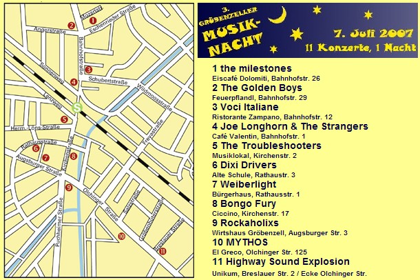 Musiknacht Ein Tipp von Mandi. Sozusagen die "Lange Nacht der Musik" im Kompaktformat. 11 Locations mit Live-Musik, alle zu Fuß abzuklappern. Ab 20 Uhr und für 10.- EUR. Hier ein Übersichtsplan (zum Mitnehmen) |