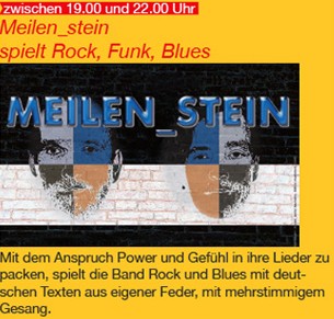 (09.07.): Das Fest ist gelaufen und das Wetter war an diesem Abend ausnahmsweise genial. Meilen_stein hat super aufgespielt, und sie haben jetzt (endlich) auch eine eigene Homepage. Ich kann mir also hier weitere Berichterstattung sparen und verweise euch einfach auf: |