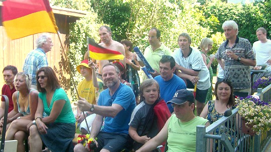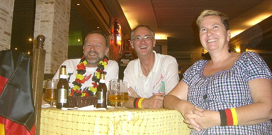 Für meine Rückkehr aus Afrika hat sich die Deutsche Nationalmannschaft mächtig ins Zeug gelegt (oder haben meine Spezln da nachgeholfen?) und in einem furiosen Spiel dem Gegner Argentinien keine Chance gelassen. Das erste Tor nach nur 3 Minuten hatte da wohl eine entscheidende Wirkung: Maradona's Jungs kamen gar nicht erst richtig ins Spiel. Der Ort des Fan-Geschehens lag diesmal wieder auf heimischen Boden: bei Bea und Flori im Garten. Die Diskussionen um das technische Setup zogen sich bis kurz vor Anpfiff hin und so bekamen wir auch das frühe Tor gar nicht recht mit, weil Flori noch an den Abdeck-Vorhängen rumnestelte. Spätestens zur 2. Halbzeit war aber alles perfekt, und die Stimmung steigerte sich von Tor zu Tor.