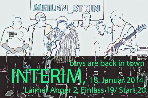 Flori und seine Mannen treten am 18.01. wieder im INTERIM in Laim auf. Die "boys are back in town", ich selber bin an diesem Abend leider "out of town". Trotzdem wünsche ich den MEILEN_ STEINEN einen tollen Gig und ein zahlreiches und begeistertes Publikum. Beim nächsten Mal bin ich dann auch wieder dabei ... |