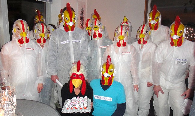 Die Einladung war ja bereits eine Herausforderung gewesen: Das Motto "INKOGNITO" verlangte einen entsprechenden "Dresscode", und Einlass sollte nur nach Vorlage einer ID-Nummer gewährt werden. Die ID-Nummer wurde nach verbindlicher Anmeldung individuell per eMail verschickt. Dass die Gästeschar letztlich in weiten Teilen einem Hühnerhof glich, war einer Idee des Stammtisch Menzing geschuldet, dass sich aber auch die Gastgeberin eines Hühnerkostüms bediente und als "Schwarze Henna" auftrat, war Zufall und Überraschung zugleich. Der STM präsentierte nicht nur einen leibhaftigen Mara-Gockl, sondern gab auch ein veritables Gegacker (samt Lied: "Ich wollt, ich wär' ein Huhn") zum Besten, und auch das "Gemeinschafts-Gelege" in Form von Überraschungs-Eiern hatte es in sich... Im Lauf des Abends fielen dann die Masken mehr oder weniger schnell. Fazit: Tolle Idee, tolles Fest!