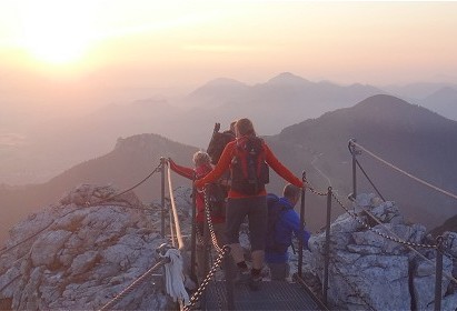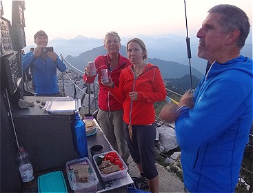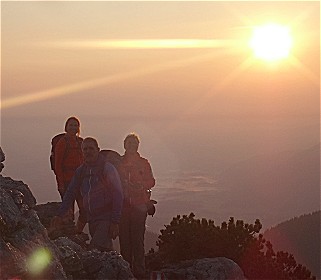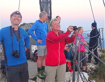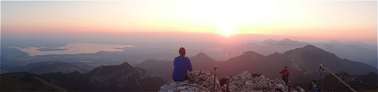 Es war Fred's Idee, mal wieder was "Verrücktes" zu tun: "Wir gehen zum Sonnenaufgang auf die Kampenwand". OK, machen wir! Um ca. 02:45 Uhr starteten wir zu siebt vom Parkplatz der Kampenwandbahn Richtung Gipfel. Die Stirnlampen sind ja heutzutage klein, leicht und leistungsfähig. Also keinerlei Probleme beim ca. 3-stündigen Aufstieg im Dunkeln. Um ca. 5:45 Uhr waren wir oben, am größten Gipfelkreuz der Bayerischen Alpen. Um ca. 6:10 Uhr kam dann die Sonne ins Spiel. Sie hatte es anfangs schwer, sich gegen eine Dunstschicht durchzusetzen, kam dann aber immer besser raus, und letztlich hat sie's auch heute wieder locker geschafft, für einen Hochsommertag mit über 30 Grad zu sorgen.