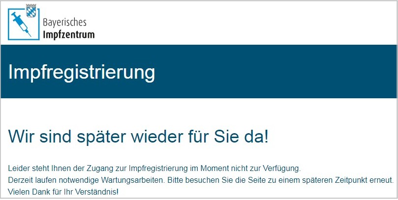 Gerade habe ich versucht, mich auf dem Portal https://impfzentren.bayern/ für eine Corona-Impfung zu registrieren, wohl wissend, dass ich als gerade mal "Ü60iger" noch lange keinen Termin bekommen werde. Aber was ist passiert? Ich habe folgende Rückmeldung bekommen: Na prima! OK, vielleicht hab' ich gerade einen ungünstigen Zeitpunkt erwischt? Ich probier's morgen früh noch mal. Aber ich konnte es mir jetzt nicht verkneifen, diese erste persönliche Negativ-Erfahrung mit der Impf-Registrierung hier zu posten. Vielleicht klappt die Registrierung ja morgen Vormittag problemlos? Egal, ich weiß ja jetzt: Die sind "später wieder" für mich da! Sehr beruhigend! Nachtrag: Beim 2. Versuch spät in der Nacht hat's dann doch geklappt! Ich bin also seit heute für die Corona-Impfung registriert. Mal sehen, wie es weitergeht. Die Zeit läuft ... |