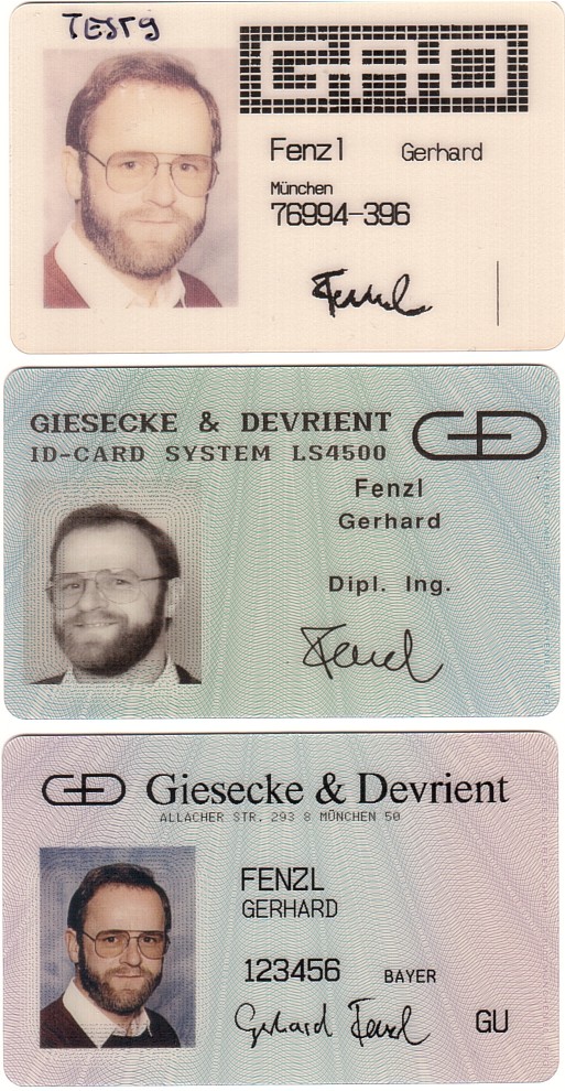 hab' ich bei der GAO, der damaligen Technik-Tochter von G+D (Giesecke & Devrient) angefangen. In Sendling, in der Drachenseestr. 12. Einige Jahre später hat sich dann mit dem Wechsel zur Mutterfirma auch mein täglicher Weg zur Arbeit geändert: Jeden Tag den halben mittleren Ring fahren bis in die Vogelweidestraße! 22 Jahre lang war ich dabei! Zum 31.08.2013 habe ich gekündigt, weil ich mein Leben ab 55 anders gestalten wollte. Ich möchte die Zeit bei GAO / G+D nicht missen, aber ich habe auch meinen Ausstieg nie bereut. Sporadische Kontakte mit Ex-Kollegen gibt es immer noch, einige waren auch auf meiner 60er-Feier dabei. Den nächsten Kontakt zu meiner Ex-Firma werde ich in Kürze in Sachen Betriebsrente aufnehmen. Ab.1. September 2021 ist es nämlich so weit! Bei 3 Ex-Kollegen möchte ich mich ganz speziell für die freundliche Aufnahme am 18.03.1991 bedanken: Erwin Lob, Alex Hierweger und "Wolli" Killar: Vielen Dank euch! Hier einige inoffizielle Test- bzw. Musterkarten aus den ersten Jahren >> PS: Zum Jahr 1991 hab' ich noch ein paar weitere 30er-"Jubiläen" parat. Ich werde beizeiten berichten ... |