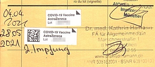 Am Ostersonntag (04.04.) hatte ich meine 1. Impfung, nachdem ich mich als enge Kontaktperson einer Person mit Pflegegrad auf Prio 2 vorgearbeitet hatte. Der 2. Termin (AstraZeneca) wäre erst am 27. Juni gewesen. Seit kurzer Zeit wird AstraZeneca aber auch im Testzentrum München West verimpft. Immer mittwochs und freitags. Und da gibt's so eine Art "Resterampe": Man kann ohne Termin ab 17:00 Uhr vorbei schauen und fragen, ob sie noch was übrig haben. Das hab' ich letzten Mittwoch probiert, da hat's nicht geklappt. Heute hab' ich's nochmal versucht: Bingo! Jetzt hab' ich einen Negativtest und den 2. Schuss!