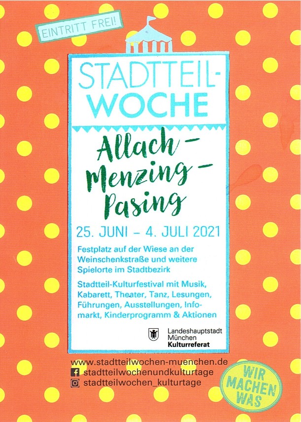 Allmählich geht wieder ein bissl was in Sachen Kultur und in Sachen Feiern. Da kommt uns die Stadtteilwoche Allach - Menzing - Pasing doch gerade recht! Zentraler Austragungsort ist wieder die "Erdbeerwiese" an der Weinschenkstraße, die schon anno 2017 zur 1200-Jahr-Feier Menzings gute Dienste geleistet hat.