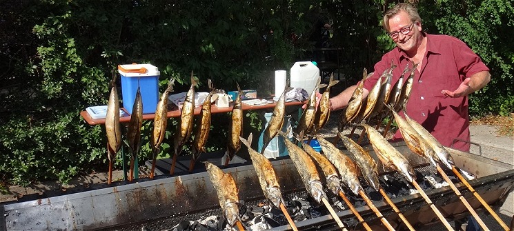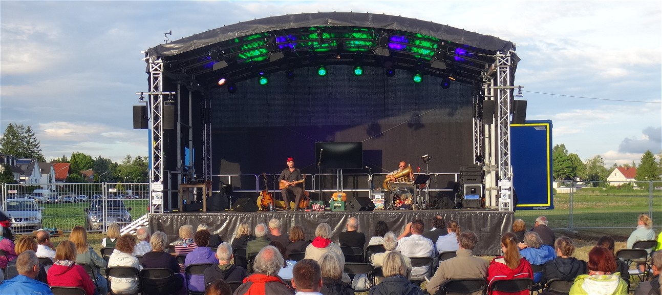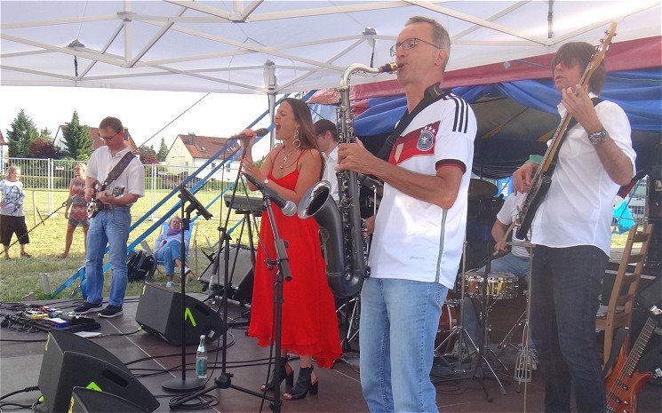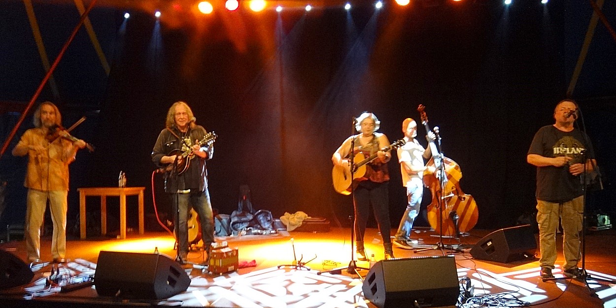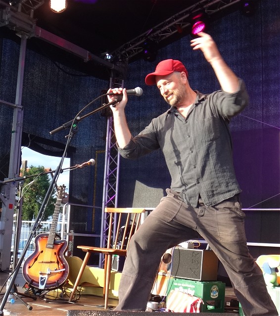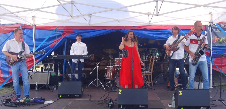 Das finale Wochenende war geprägt von 2 Super-Sommertagen: Freitag und Samstag. Leider war der Abschluss-Sonntag wettermäßig durchwachsen. Bis zum späten Nachmittag alles noch im grünen Bereich, aber ab ca. 19 Uhr fiel so manches ins Wasser - vor allem die Zuschauerzahlen! Wir waren trotzdem dabei, und es hat sich gelohnt: Ab 18 Uhr spielte die "Burning Biscuit Band" auf. Eine Mischung aus Irish - Keltisch - Divers. Leider waren nur ca. 20 Leute im Publikum. Mein Sonderapplaus gehörte dem Musiker ganz rechts: Unglaublich, was der aus seiner Mini-Flöte rausholte!