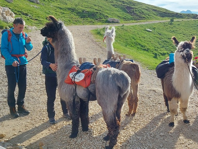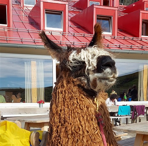 Das Wetter war durchwachsen, wir wurden praktisch jeden Tag (außer am Donnerstag) nachmittags "durchgewaschen". Am Dienstag Nachmittag erreichte das schräge Wetter - nach unserer erfolgreichen Kesselkogel-Überschreitung (3002 m) - seinen Höhepunkt: Zum Regen kam brachialer Wind dazu, dem ich mit Fug und Recht "patagonische Qualität" bescheinigt habe. Dafür wurden wir dann auf der Thierser Alpl mit Hütten-Luxus entschädigt. Es gab dort auch ein sehr nettes Gespräch mit dem Chef des Kaserhofs in Oberbozen. Der war gerade mit einer Gruppe auf "Lama-Tour" unterwegs und saß am Nebentisch. Die absolvierten Klettersteige können sich sehen lassen: Rotwand, Masarè, Santnerpass, Kesselkogel und Scalette. Auf den ersten 3 war ich nicht dabei, weil's mir am ersten Tag nicht gut ging und weil wir für den 2. Tag wetterbedingt beschlossen hatten, statt über den Santnerpass über das Tschager Joch zu gehen. Aber beim 3000er war ich natürlich dabei! Insgesamt war's wieder eine sehr gelungene Bergwoche mit perfektem Ausklang im Batzen zu Bozen. Ich könnte noch viel berichten, lass' es aber mal mit diesen paar Fotos bewenden: Lamas und wir!