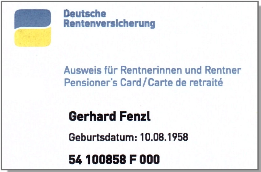 Endlich Rentner! Jetzt ist es offiziell: Nach 8 Jahren "Durststrecke" bin ich vom Privatier zum Rentner aufgestiegen. Das Ausfüllen des Rentenantrags war eine Herausforderung, aber letztlich hat alles geklappt. Das erste Geld werde ich zwar erst Ende September sehen, aber das halt' ich jetzt auch noch durch! Meinen Rentner-Ausweis hab' ich aber schon mal! |