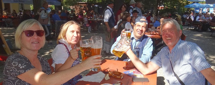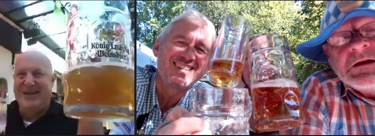 18.09.: Wiesn-Opening: Halt mal wieder anders! Heute um 12:00 Uhr wäre die Wiesn 2021 eröffnet worden. Schon zum zweiten Mal hintereinander konnte, sollte, durfte sie nicht stattfinden. Letztes Jahr haben wir einen eigenen kleinen Wiesneinzug organisiert, und ein privates Wiesn-Opening. Heuer kam uns die Allacher Schießstätte gelegen: Dort gab's bei perfektem Wiesnwetter im Biergarten ein "O´zapft is", mit Blasmusik, Goaslschnoizern, Steckerlfisch und allem, was dazu gehört. Sehr lässige bayerische Stimmung! Für uns gehörte auch dazu, dass wir eine Live-Schalte zu unserem Spezl Bernie nach Peking machen wollten. "Menzing meets Peking", könnte man es nennen. Und es hat geklappt! Akustisch war's zwar etwas schwierig, denn wir hatten unsererseits keine Zusatzlautsprecher dabei. Aber: Die Bildersprache hat funktioniert: Wir konnten synchron miteinander anstoßen! Hier ein paar Eindrücke vom Wiesn-Opening 2021 in der Schießstätte Allach: