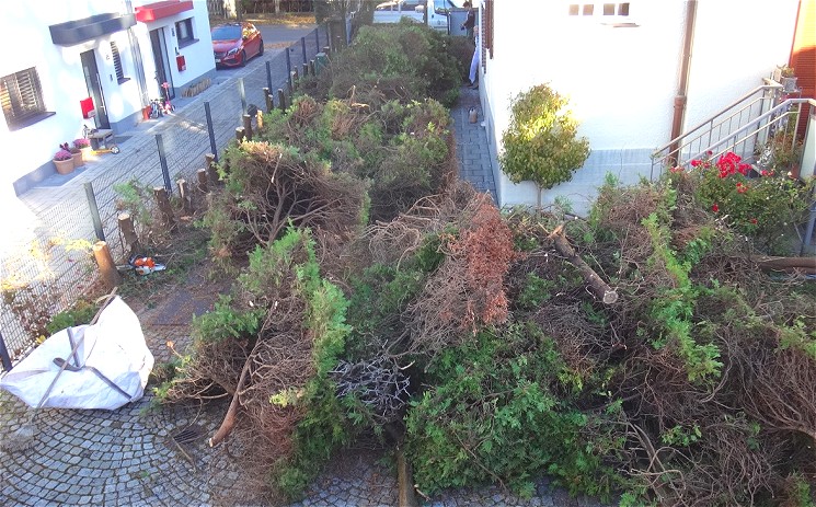 Da unsere Einfahrt kaum mehr von PKWs genutzt wird, haben wir beschlossen, sie zu begrünen. Hier ist das Ergebnis: Nein, Quatsch! Die alte, kranke Hecke wird durch eine junge neue ersetzt. Ich stelle dann von der gleichen Stelle aus ein "Nachher"-Foto hier ein, wenn die Aktion abgeschlossen ist. |
