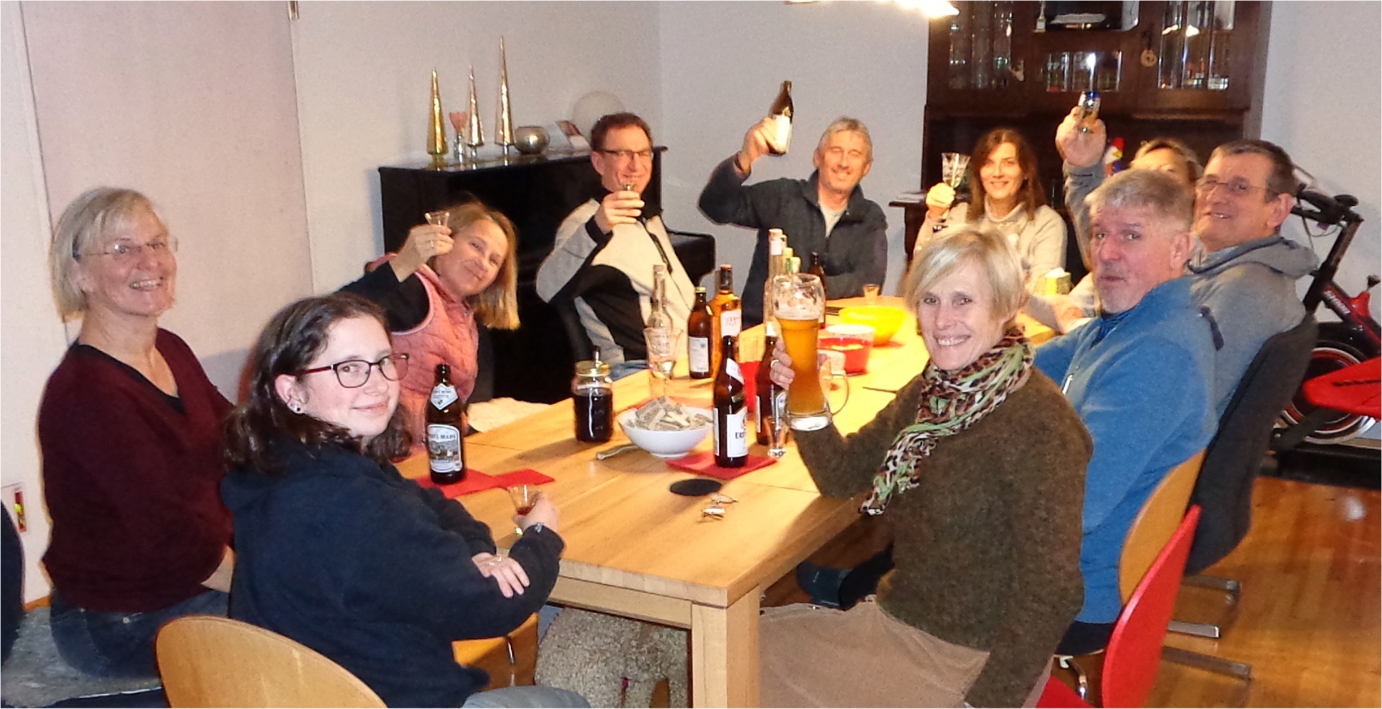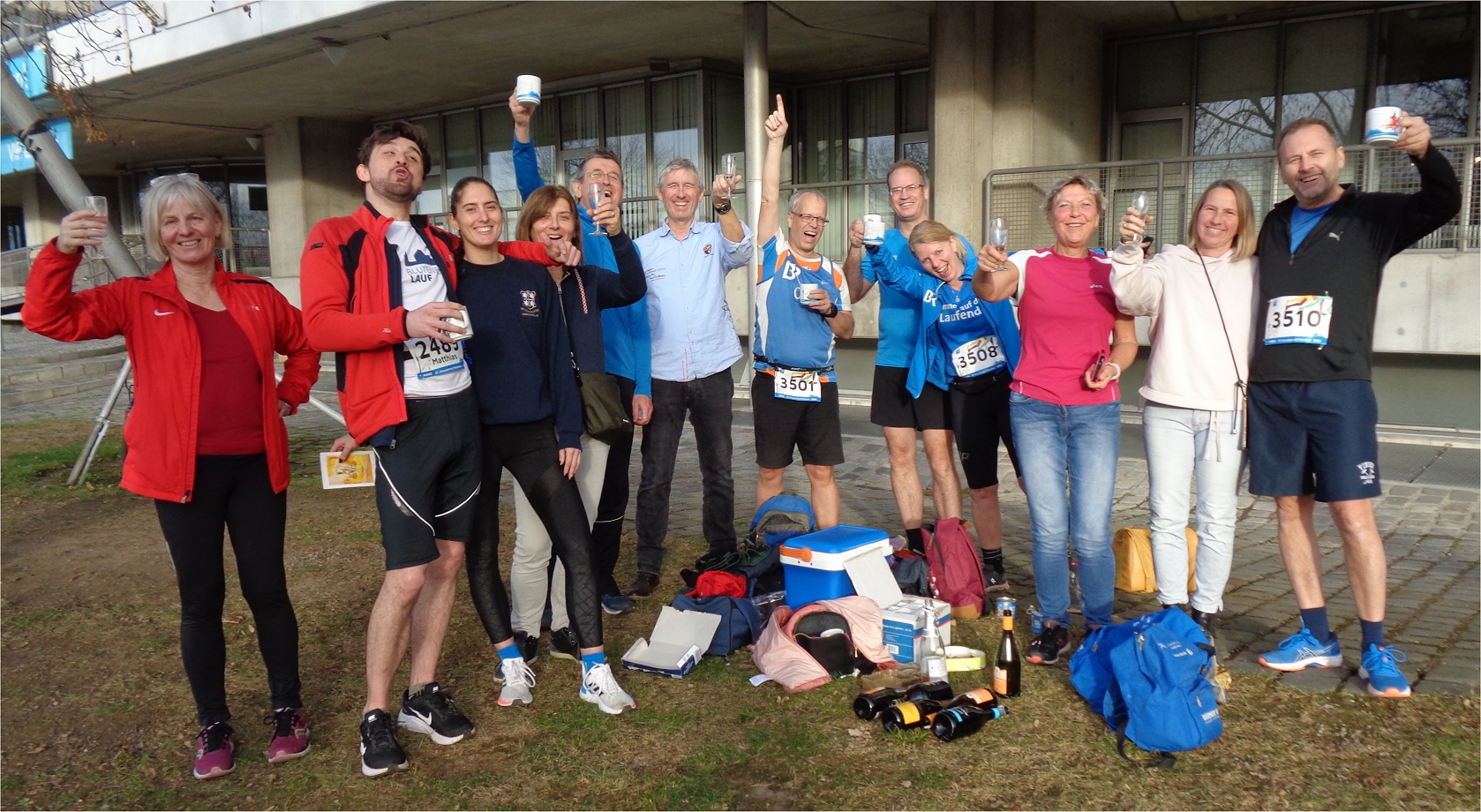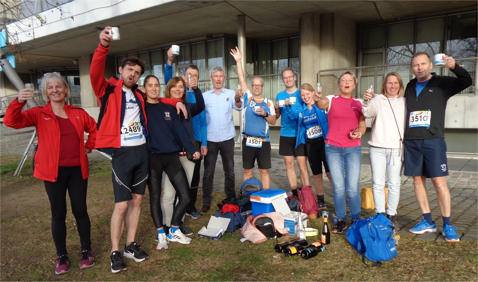 Seit 2 Jahren war der Münchner Silvesterlauf Corona-bedingt ausgesetzt. Heute fand er wieder statt! Bei Frühlingstemperaturen um die 19 Grad! Im Vorfeld war es etwas mühsam gewesen, unsere potentiellen Teilnehmer zu motivieren. Aber es kam dann doch ein passables Grüppchen von Aktiven und Zuschauern zusammen. Sehr nett auch, dass wir uns mit dem befreundeten Verein SGBR zusammengefunden haben. Stefan vom SGBR hatte die gleiche "Intervalltaktik" wie ich, und so sind wir ab km 4 im Lauf-Geh-Wechsel (mit viel Gequatsche) beide gemeinsam relaxt ins 10km-Ziel gekommen. Bingo! Traditionell war die Gruppe STM / SGBR wieder mal die allerletzte vor dem Olympiastadion. Ganz zum Schluss gesellten sich auch noch Co-Veranstalter Knut und seine Frau Hanni zu uns. Ein sehr schönes Wiedersehen! |
