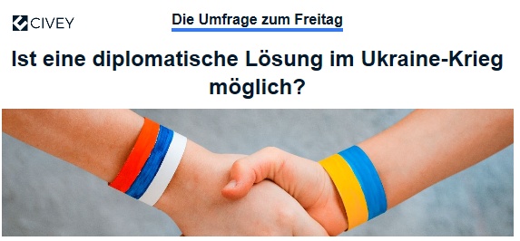 Wahrlich kein schöner Jahrestag. Ein schrecklicher, ein unfassbarer, ein verabscheuungswürdiger. Nun kam mir heute folgende Civey-Umfrage unter: Meine Antwort (die ich in der Umfrage nicht so anbringen konnte) ist klar: MIT PUTIN NICHT! Wenn dieser Despot, Amokläufer und Kriegsverbrecher endlich mal weg ist (egal wie!), kann und MUSS man über alles reden: Waffenstillstand, Rückzug der russischen Truppen, Zukunft der besetzten Gebiete, Wiederaufbau der Ukraine, Reparationszahlungen, künftiger Status der Ukraine in der EU und der NATO ... Etwa in dieser Reihenfolge. Was ich mich in diesem vergangenen Jahr immer wieder gefragt habe: Warum macht ein großer Teil der Russischen Bevölkerung bei dieser Kamikaze-Unternehmung IMMER NOCH mit? Warum lässt sich das Militär IMMER NOCH als Kanonenfutter verheizen? Ich verstehe es NICHT! Parallelen zu NAZI-Deutschland bieten sich an, und ja, auch da haben bei uns ganz Viele weggeschaut und Hitler und seine Schergen gewähren lassen oder sogar unterstützt. Warum auch immer! Sind wir nicht weiter gekommen? Offenbar nicht. Putin ist für mich der Hitler des 21. Jahrhunderts. Er steckt die Welt in Brand und mir ist angst und bang, was dieser Irre in seinem Frust noch alles anzettelt. Hitler hatte damals wenigstens keine Atombomben (die USA hatten welche, das schreckliche Geschehen in den letzten Kriegstagen von WW2 ist bekannt). Aber Putin HAT SIE! Und ich wiederhole mich seit fast einem Jahr ständig (aber auf mich hört ja keiner): Putin MUSS WEG! Je schneller, je besser! Es lebe die Ukraine! (bei der natürlich auch nicht alles unumstritten ist). |