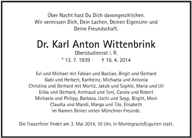 (26.04.) Traueranzeige in der "Süddeutschen" Heute erschien unsere gemeinsame Traueranzeige in der Süddeutschen Zeitung. Herzlicher Dank gebührt dafür an erster