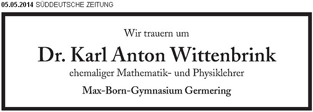 In der heutigen SZ-Ausgabe hat das Max-Born-Gymnasium - Karls letzte Wirkungsstätte als Lehrer - seiner gedacht. Die Traueranzeige ist (wie die der Münchner Freunde) auch auf dem Trauerportal der SZ zu sehen. Auch einige neue virtuelle Kerzen wurden dort für Karl angezündet ...