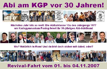 Letzten Dienstag bin ich mit Klausi zusammen gesessen und wir haben die Randbedingungen für unsere Abi-Revival-Fahrt noch mal durchgecheckt. Es bleibt beim Termin 01. bis 04.11.2007. Eine Postkarte mit den Eckdaten ist gestern an alle 43a-ler rausgegangen. Bin schon gespannt auf die Rückmeldungen... |