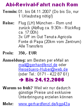 Damit fehlen nur noch die Rückmeldungen von Niko, Hupe, Obi und Schmoizl. Wir werden heute noch den Vogl Toni und Herrn Petermann anschreiben und sie zur Klassenfahrt einladen. Angesichts des Anmeldestandes sieht es so aus, als würde die Revival-Fahrt 2007 die von 2002 locker toppen können. Tolle Sache! |