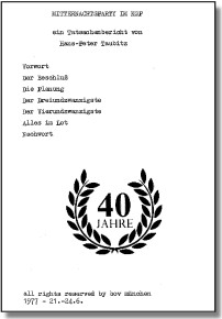 Betreff: Mitternachtsparty im KGP, Text: "... vielleicht kannst Du ja Deiner nächsten Rundmail meine 100% analog remasterte 40th-anniversary-edition der Mitternachtsparty-Story anfügen. Ist ja vielleicht in den Details nicht mehr allen 53 A'lern präsent ..." Zugegeben, ich hab' sehr langsam reagiert und habe es Hupe nahegelegt, seine Story selbst unter die Leute zu bringen. Das hat er mittlerweile auch getan, und ich hab' seine Genehmigung bekommen, die Story hier zu veröffentlichen. Wer also nochmal tiefer in die Abgründe unseres KGP-Finales anno 1977 eintauchen möchte, hat hier auf 36 kurzweiligen Seiten die Gelegenheit dazu. Der Chronist in mir fragt sich natürlich sofort: Gibt's denn da keine Fotos? Ich werde noch mal in mich bzw. in meine Archive gehen, aber momentan ist mir nicht bewusst, dass es da was gäbe. Damals war schließlich noch nicht mal das Wort "Action Cam" erfunden, geschweige denn die Technologie dazu. OK, wir hätten ein paar Polaroids schießen können ... |