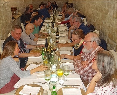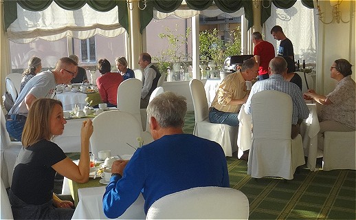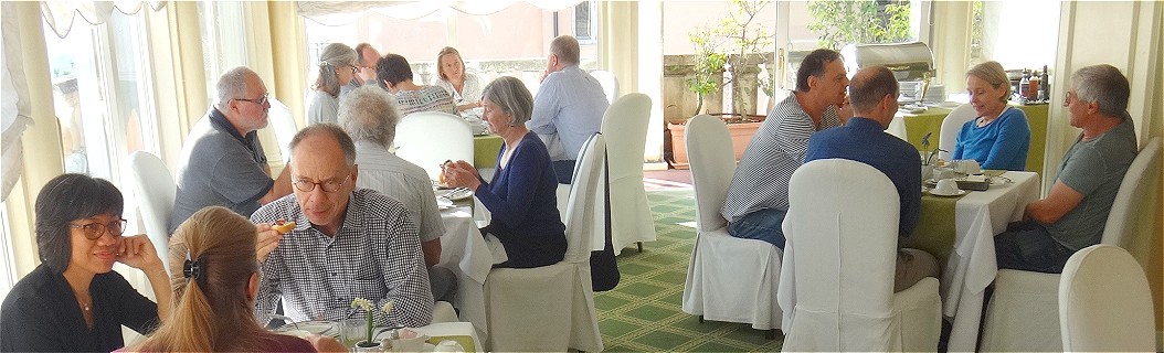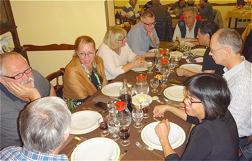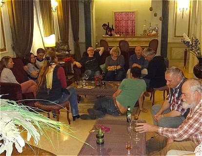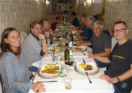 Da wir noch 4 Nachzügler erwarteten, war es das Einfachste, das Abendessen im Hotel zu organisieren. Und so trafen wir uns alle um 20 Uhr in den Katakomben des Hotels an einem riesengroßen Tisch. Anfangs liefen die Getränke-Bestellungen noch etwas zögerlich, aber als wir dann beschlossen, dass "alles auf eine Rechnung" geht, gab's kein Halten mehr! Die Zeche war dann auch mit Abstand die höchste der ganzen Reise, aber was soll's? Es war ein gelungener Auftakt! |