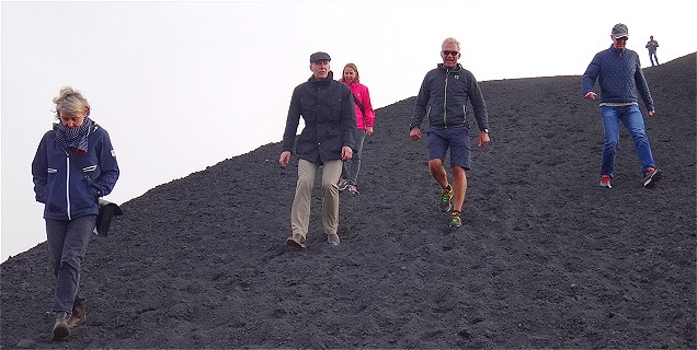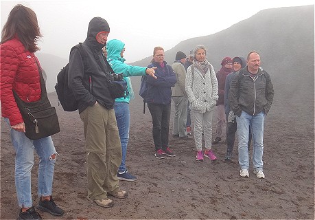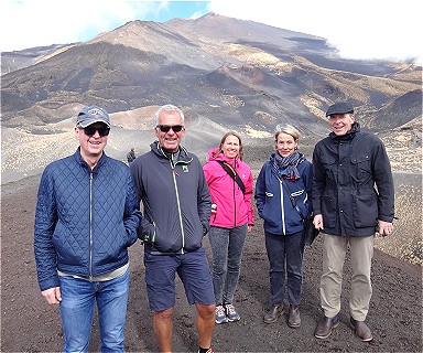 Unsere erste Tagestour führte uns zum Ätna, und nachmittags weiter nach Taormina. "Mama Ätna" gab sich zunächst geheimnisvoll nebelverhangen, bei den Spaziergängen rund um die Crateri Silvestri riss es dann aber immer mal wieder auf und man konnte die riesigen Vulkangebiete recht gut überblicken. Das spontan organisierte Mittagessen in einem kleinen Weingut war super: Verschiedene kleine Gerichte und guter Wein, und alles geht ruck-zuck! |