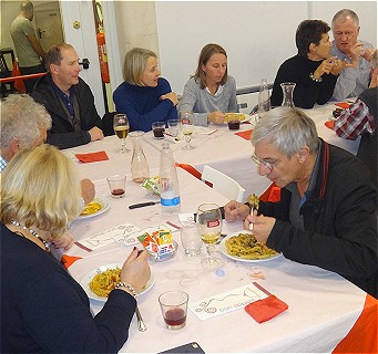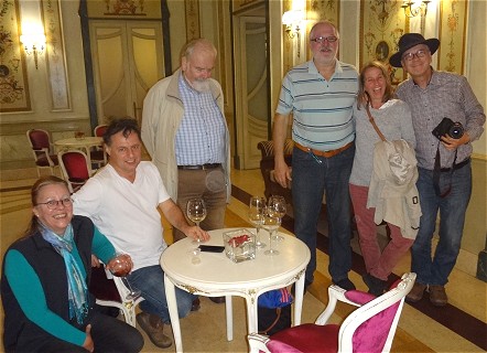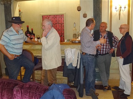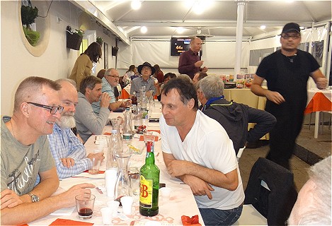Abends fuhren wir dann mit dem Linienbus nach Downtown Catania. Arntraud und Toni hatten ein Lokal direkt am alten Castello ausfindig gemacht. Hier starteten wir einen Versuch, der eigentlich von vornherein zum Scheitern verurteilt war: 26 Leute bestellten "A la carte". Das konnte nicht wirklich klappen! Immerhin kam der Wein-Nachschub sehr zügig und letztlich musste auch niemand hungrig vom Tisch aufstehen. Der Stimmung tat's jedenfalls keinen Abbruch. Der Wirt hat selber gemerkt, dass nicht alles top war, hat die Rechnung reduziert und uns noch eine Flasche Jim Beam samt Plastik-Bechern spendiert. Die Heimfahrt gestaltete sich entsprechend lustig, ebenso der finale Absacker an der Hotelbar ... |
