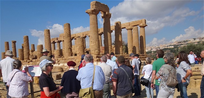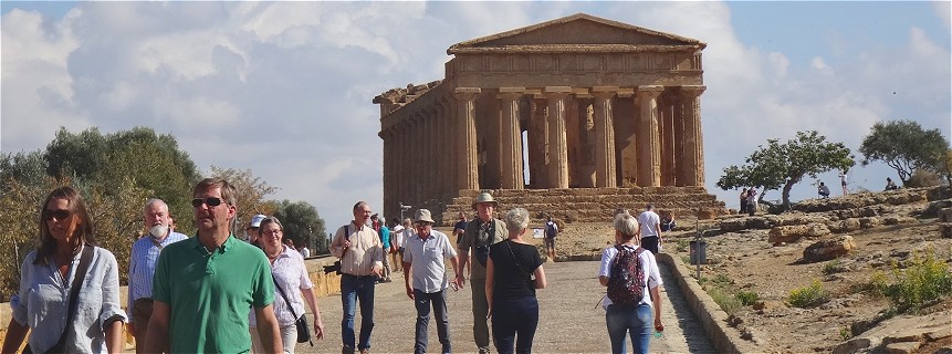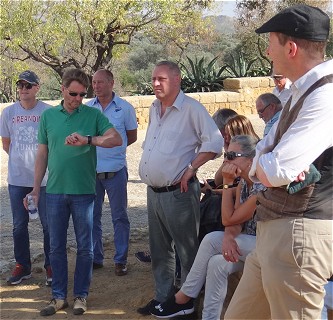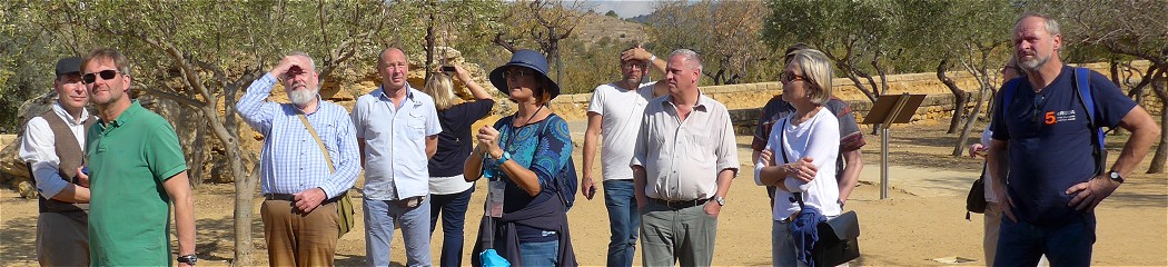 Obwohl es gestern ja durchaus spät geworden war, saßen heute alle um Punkt 8 Uhr im Bus. Alle? Na ja, alle außer Christian: Der musste sich leider schon wieder ausklinken. Die Geschäfte rufen ... Immerhin haben wir auf der Hotel-Treppe noch ein paar "Klassenfotos" mit Christian schießen können. Der Rest der Truppe machte sich auf zu einer langen Busfahrt nach Agrigent. Das lohnte sich aber absolut, denn wir erlebten das Tal der Tempel bei prächtigem Wetter und minimalem Touristen-Andrang. |