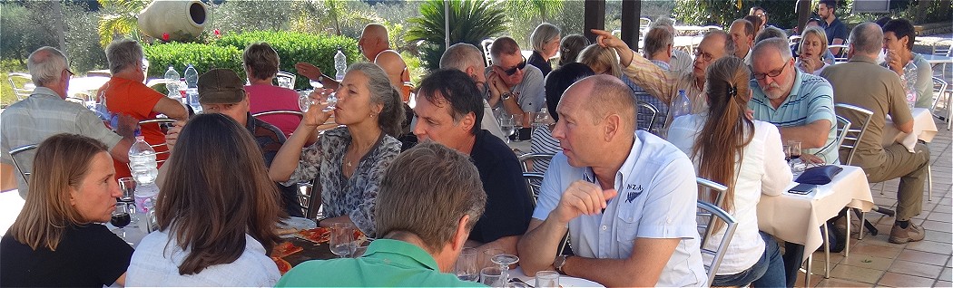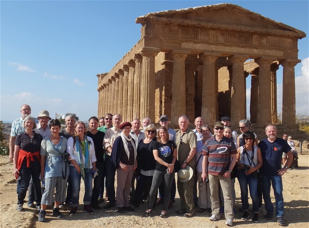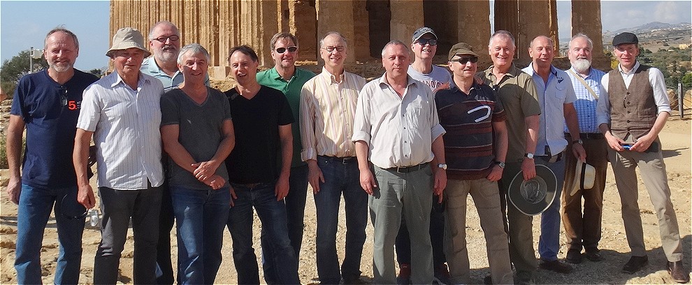 Klaus und ich wurden viel gelobt für die Vorbereitung des Trips, das Lob kann ich an die Gruppe zurück geben: alles sehr harmonisch und entspannt, kein Rum-Genörgel und (fast) immer pünktlich zu den vereinbarten Zeiten da. Den Terminus "Sauhaufen" musste ich kein einziges Mal in den Mund nehmen. So macht das Organisieren Spaß! Die 3 Tagesausflüge liefen wie geplant ab, unsere Reiseleiterin Florinda hat's schnell begriffen, dass wir keine 08/15-Truppe sind, und hat zu diversen Themen auch unsere "Experten" zu Wort kommen lassen, bzw. sie dann sogar herausgefordert. Unser Busfahrer Luca hat uns viele 100km über die Insel kutschiert, am letzten Abend hatte er beim Transfer zum und vom Agriturismo noch a "schwaare Partie", war aber trotzdem am Sonntag morgen wieder pünktlich zur Stelle. Mit Abstand am unplanmäßigsten war der Rückflug: Die Hauptgruppe saß wegen eines heftigen Unwetters geschlagene 3 Stunden am Flughafen Rom fest, in München fuhren dann zunächst wegen eines Polizeieinsatzes keine S-Bahnen, und beim Auspacken des Koffers stellte sich heraus, dass alle Klamotten triefnass waren. Da hat das Gepäck beim Umladen in Rom wohl ein unfreiwilliges Bad genommen? Aber - finalmente - sind alle gut heim gekommen! |