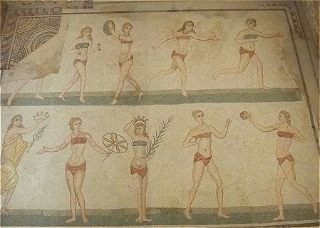 Nach der Mittagspause ging es dann weiter Richtung Piazza Armerina, wo wir die berühmte Villa del Casale mit ihren Mosaiken besichtigten. Aufgrund eines Erdrutsches waren die Mosaiken über Jahrhunderte von einer Schlammschicht bedeckt. Das ist der Grund, warum sie heute noch so bemerkenswert gut erhalten sind. |